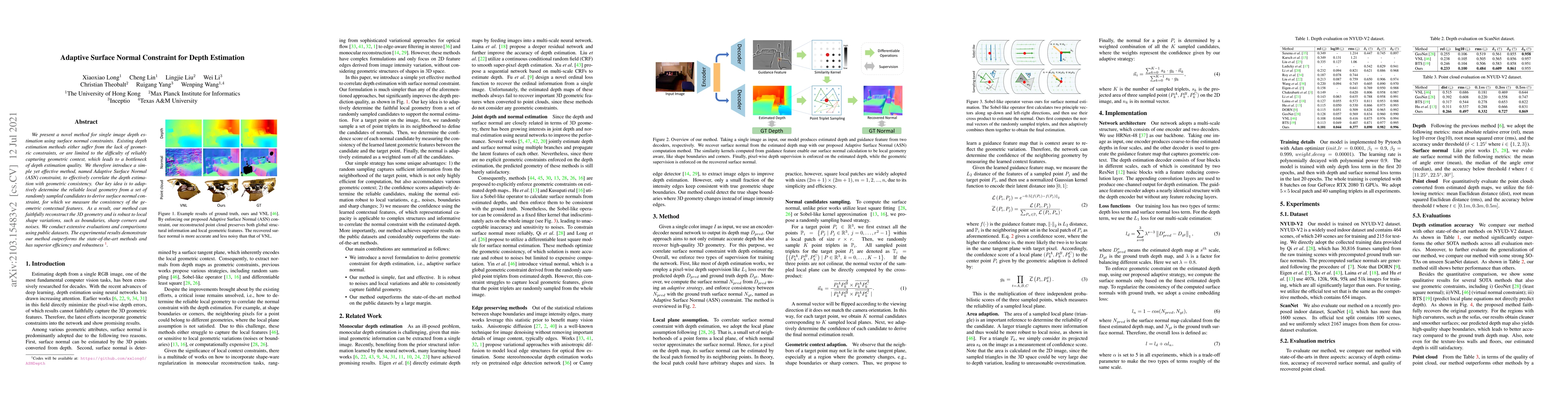 A new method called Adaptive Surface Normal (ASN) constraint is introduced for single image depth estimation, improving geometric consistency and robustness, with experimental results showing it outperforms state-of-the-art methods.