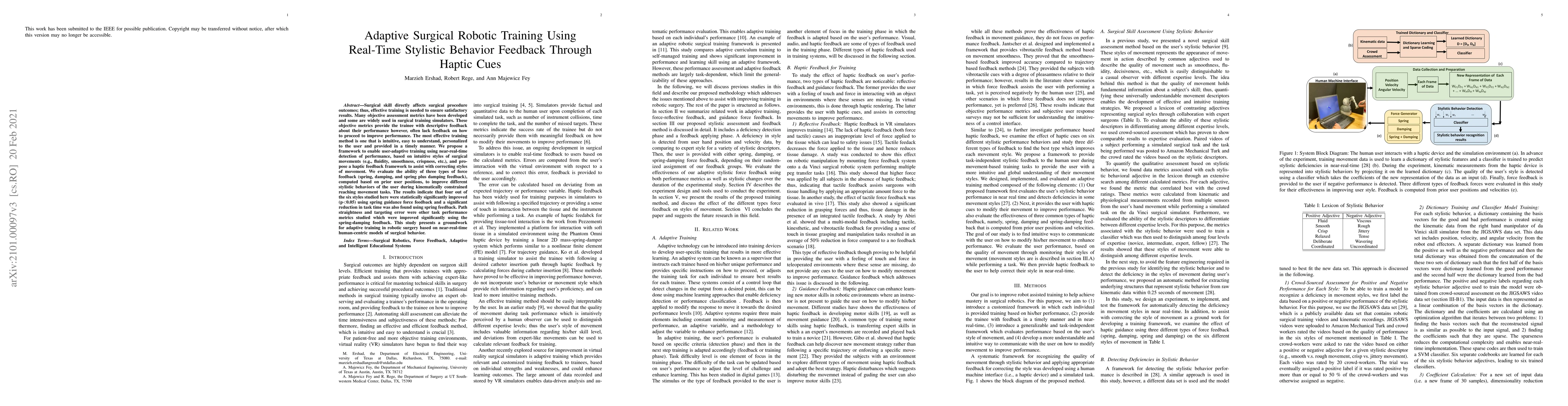 Surgical skill directly affects surgical procedure outcomes; thus, effective training is needed to ensure satisfactory results. Many objective assessment metrics have been developed and some are widely used in surgical training simulators. These objective metrics provide the trainee with descriptive feedback about their performance however, often lack feedback on how to proceed to improve performance. The most effective training method is one that is intuitive, easy to understand, personalized to the user and provided in a timely manner. We propose a framework to enable user-adaptive training using near-real-time detection of performance, based on intuitive styles of surgical movements (e.g., fluidity, smoothness, crispness, etc.), and propose a haptic feedback framework to assist with correcting styles of movement. We evaluate the ability of three types of force feedback (spring, damping, and spring plus damping feedback), computed based on prior user positions, to improve different stylistic behaviors of the user during kinematically constrained reaching movement tasks. The results indicate that four out of the six styles studied here were statistically significantly improved (p<0.05) using spring guidance force feedback and a significant reduction in task time was also found using spring feedback. The path straightness and targeting error in the task were other task performance metrics studied which were improved significantly using the spring-damping feedback. This study presents a groundwork for adaptive training in robotic surgery based on near-real-time human-centric models of surgical behavior.