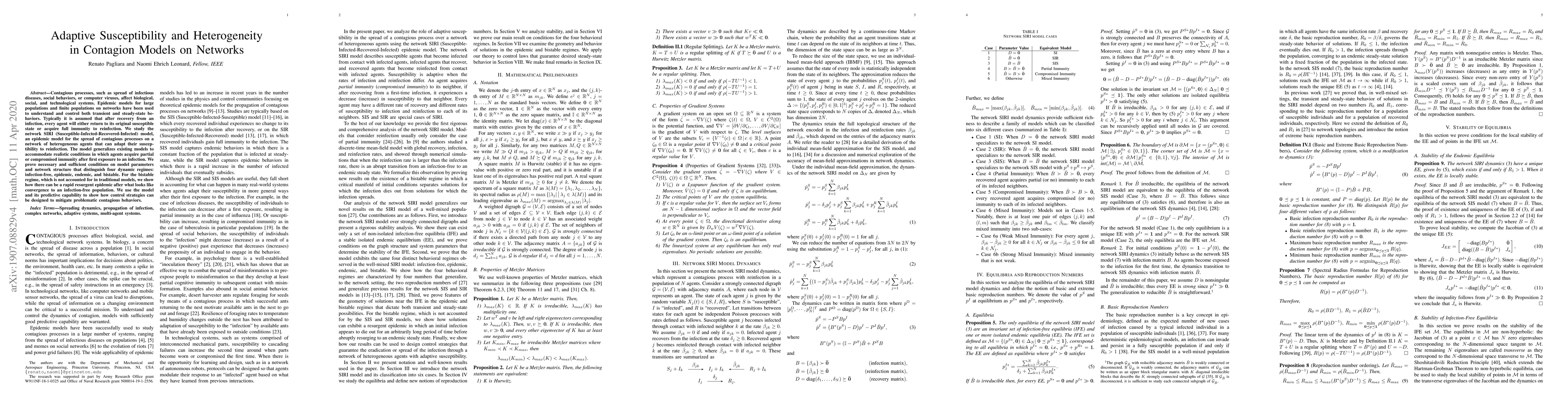 Contagious processes, such as spread of infectious diseases, social behaviors, or computer viruses, affect biological, social, and technological systems. Epidemic models for large populations and finite populations on networks have been used to understand and control both transient and steady-state behaviors. Typically it is assumed that after recovery from an infection, every agent will either return to its original susceptible state or acquire full immunity to reinfection. We study the network SIRI (Susceptible-Infected-Recovered-Infected) model, an epidemic model for the spread of contagious processes on a network of heterogeneous agents that can adapt their susceptibility to reinfection. The model generalizes existing models to accommodate realistic conditions in which agents acquire partial or compromised immunity after first exposure to an infection. We prove necessary and sufficient conditions on model parameters and network structure that distinguish four dynamic regimes: infection-free, epidemic, endemic, and bistable. For the bistable regime, which is not accounted for in traditional models, we show how there can be a rapid resurgent epidemic after what looks like convergence to an infection-free population. We use the model and its predictive capability to show how control strategies can be designed to mitigate problematic contagious behaviors.