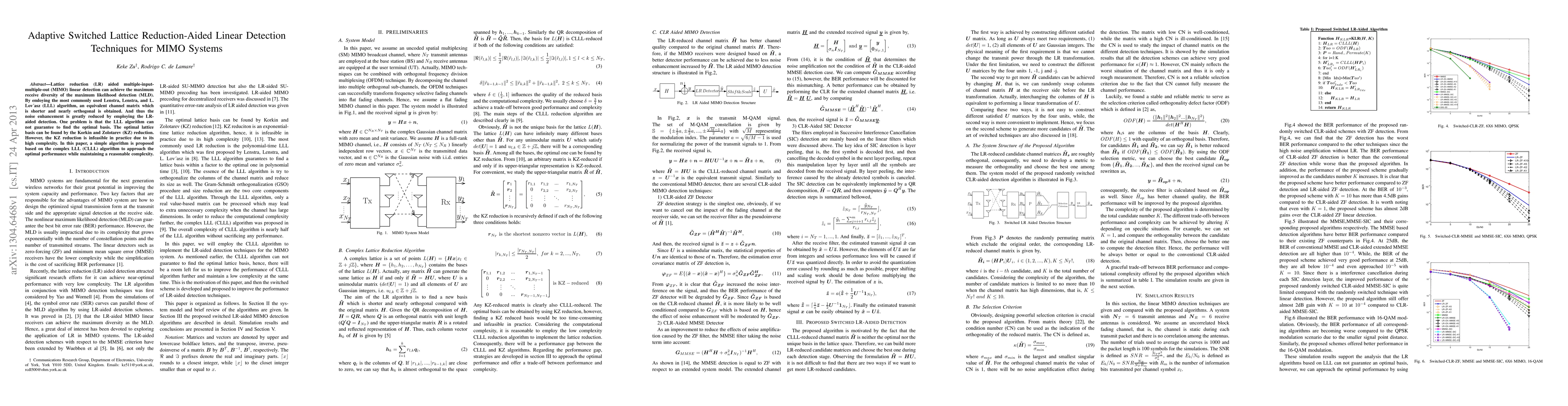 This paper proposes an adaptive switched lattice reduction technique for MIMO systems, combining the LLL algorithm for practical complexity with the KZ reduction for optimal performance, aiming to achieve maximum receive diversity while minimizing noise enhancement. The proposed algorithm balances complexity and performance to approach optimal detection.