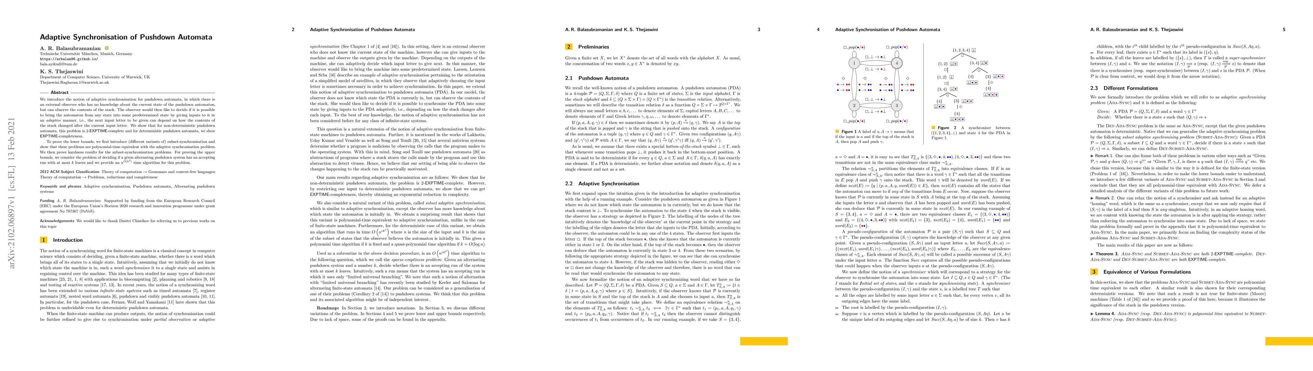 The paper introduces the concept of adaptive synchronization for pushdown automata and proves its complexity for both non-deterministic and deterministic cases, establishing equivalences with other synchronization problems.