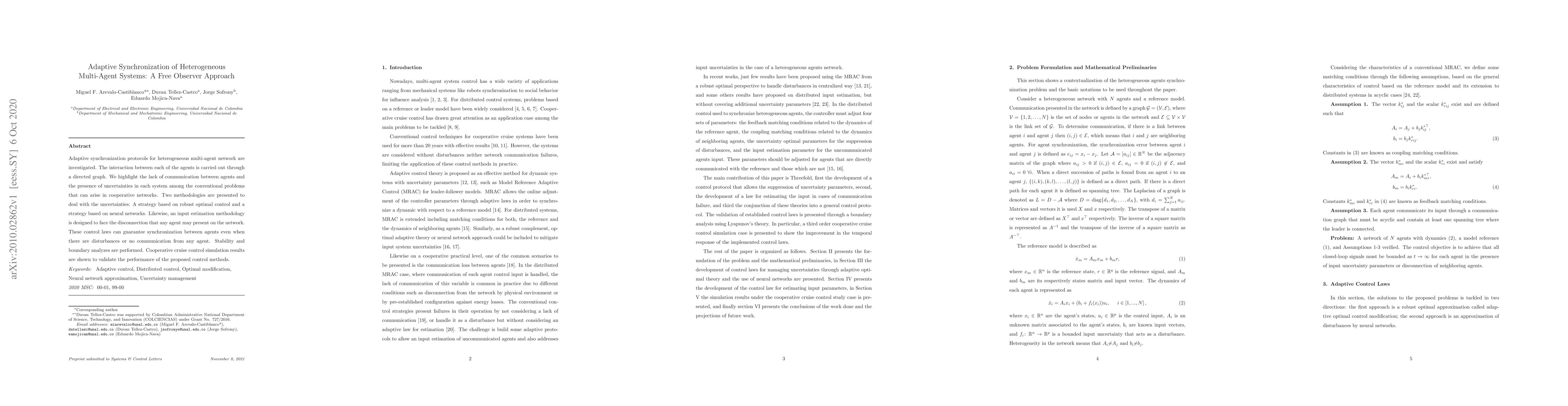 Adaptive synchronization protocols for heterogeneous multi-agent network are investigated. The interaction between each of the agents is carried out through a directed graph. We highlight the lack of communication between agents and the presence of uncertainties in each system among the conventional problems that can arise in cooperative networks. Two methodologies are presented to deal with the uncertainties: A strategy based on robust optimal control and a strategy based on neural networks. Likewise, an input estimation methodology is designed to face the disconnection that any agent may present on the network. These control laws can guarantee synchronization between agents even when there are disturbances or no communication from any agent. Stability and boundary analyzes are performed. Cooperative cruise control simulation results are shown to validate the performance of the proposed control methods.