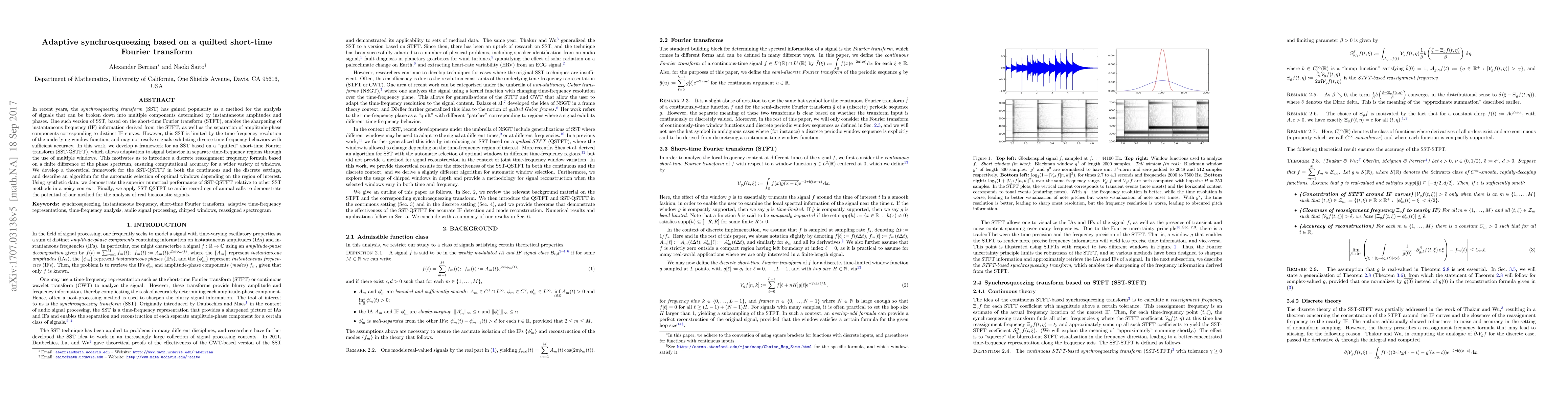 This paper introduces an adaptive synchrosqueezing transform based on a quilted short-time Fourier transform (SST-QSTFT) that uses multiple windows to adapt to diverse time-frequency signal behaviors. The proposed method demonstrates superior performance over traditional SST methods, as shown through synthetic data and real bioacoustic signal analysis.