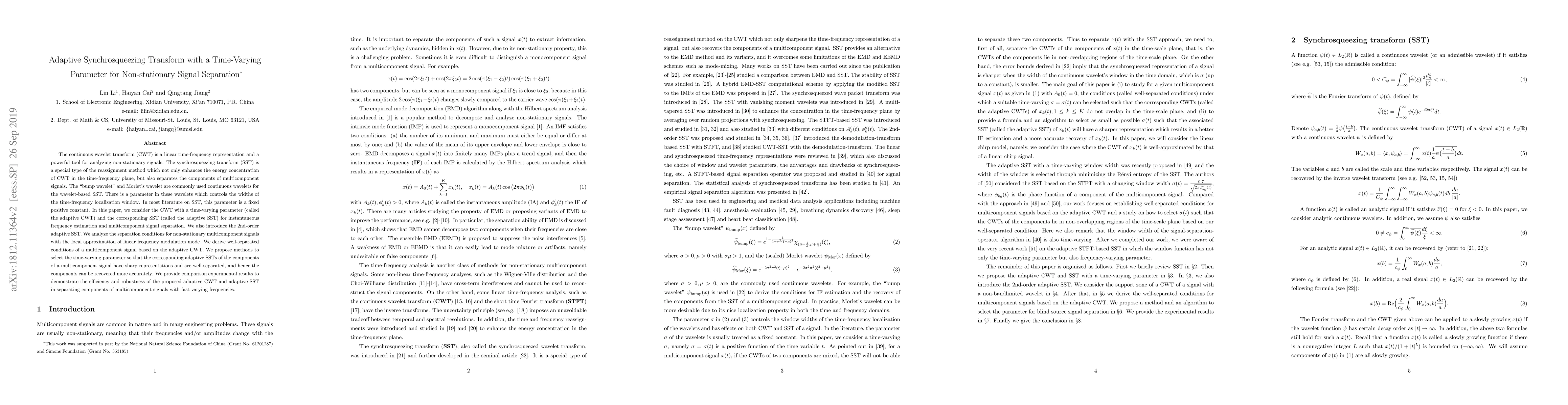 This paper proposes an adaptive synchrosqueezing transform (SST) with a time-varying parameter for non-stationary signal separation, enhancing the continuous wavelet transform (CWT) and improving component recovery accuracy. Experimental results show the efficiency and robustness of the adaptive SST in separating signals with fast frequency variations.