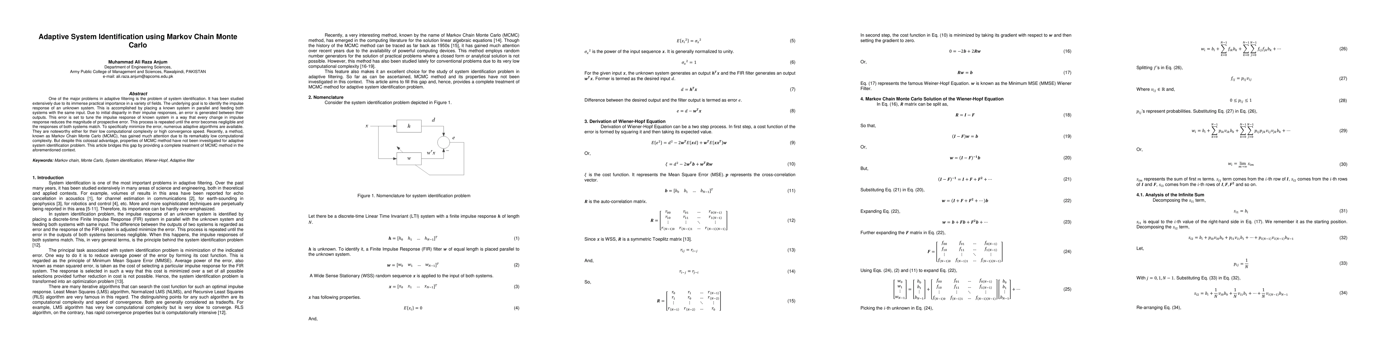 One of the major problems in adaptive filtering is the problem of system identification. It has been studied extensively due to its immense practical importance in a variety of fields. The underlying goal is to identify the impulse response of an unknown system. This is accomplished by placing a known system in parallel and feeding both systems with the same input. Due to initial disparity in their impulse responses, an error is generated between their outputs. This error is set to tune the impulse response of known system in a way that every change in impulse response reduces the magnitude of prospective error. This process is repeated until the error becomes negligible and the responses of both systems match. To specifically minimize the error, numerous adaptive algorithms are available. They are noteworthy either for their low computational complexity or high convergence speed. Recently, a method, known as Markov Chain Monte Carlo (MCMC), has gained much attention due to its remarkably low computational complexity. But despite this colossal advantage, properties of MCMC method have not been investigated for adaptive system identification problem. This article bridges this gap by providing a complete treatment of MCMC method in the aforementioned context.