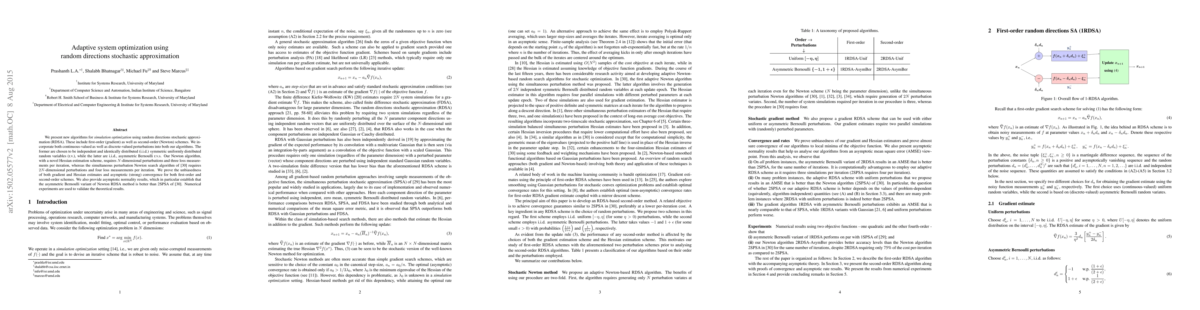 We present novel algorithms for simulation optimization using random directions stochastic approximation (RDSA). These include first-order (gradient) as well as second-order (Newton) schemes. We incorporate both continuous-valued as well as discrete-valued perturbations into both our algorithms. The former are chosen to be independent and identically distributed (i.i.d.) symmetric, uniformly distributed random variables (r.v.), while the latter are i.i.d., asymmetric, Bernoulli r.v.s. Our Newton algorithm, with a novel Hessian estimation scheme, requires N-dimensional perturbations and three loss measurements per iteration, whereas the simultaneous perturbation Newton search algorithm of [1] requires 2N-dimensional perturbations and four loss measurements per iteration. We prove the unbiasedness of both gradient and Hessian estimates and asymptotic (strong) convergence for both first-order and second-order schemes. We also provide asymptotic normality results, which in particular establish that the asymmetric Bernoulli variant of Newton RDSA method is better than 2SPSA of [1]. Numerical experiments are used to validate the theoretical results.
