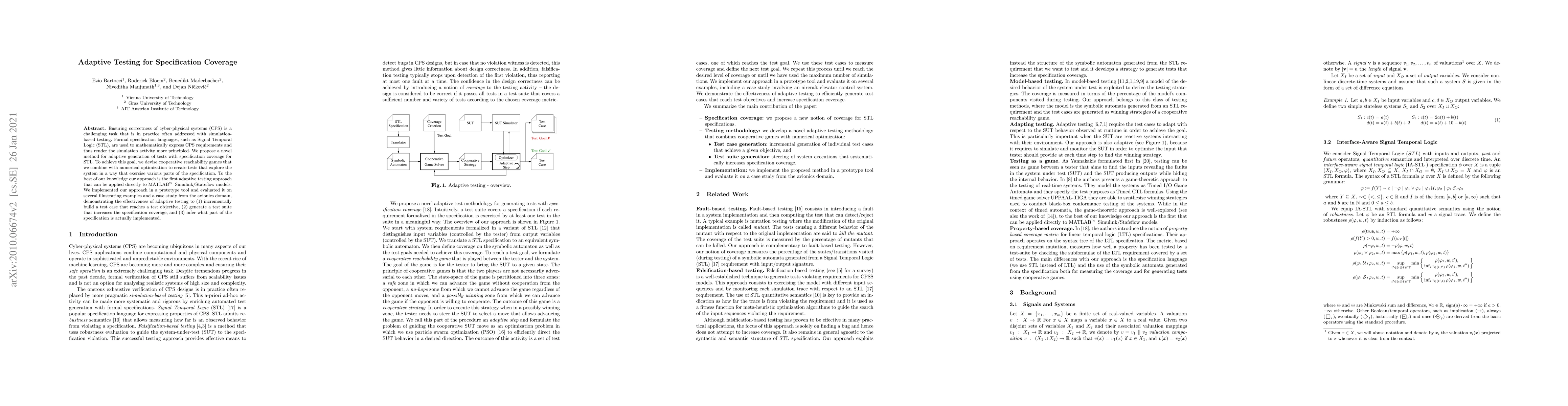 This paper proposes an adaptive testing method for ensuring the correctness of cyber-physical systems using Signal Temporal Logic specifications. The method employs cooperative reachability games and numerical optimization to generate tests that incrementally cover various parts of the system's specification, evaluated effectively on MATLAB Simulink/Stateflow models and an avionics case study.