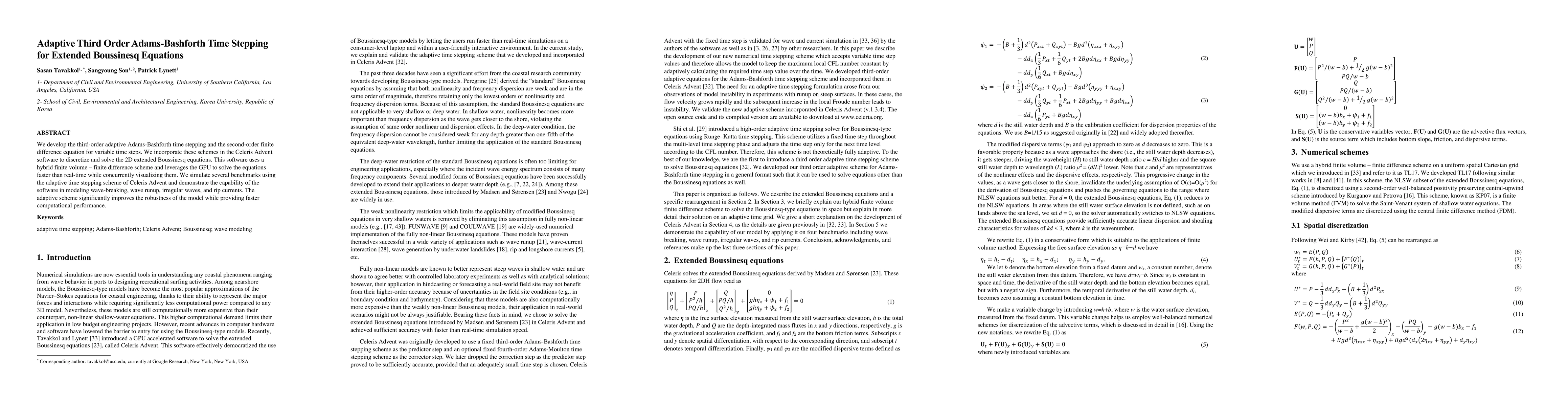 This paper introduces an adaptive third-order Adams-Bashforth time stepping method integrated into the Celeris Advent software to solve the 2D extended Boussinesq equations. The adaptive scheme enhances computational efficiency and robustness, enabling real-time simulations of complex coastal phenomena like wave-breaking and rip currents.