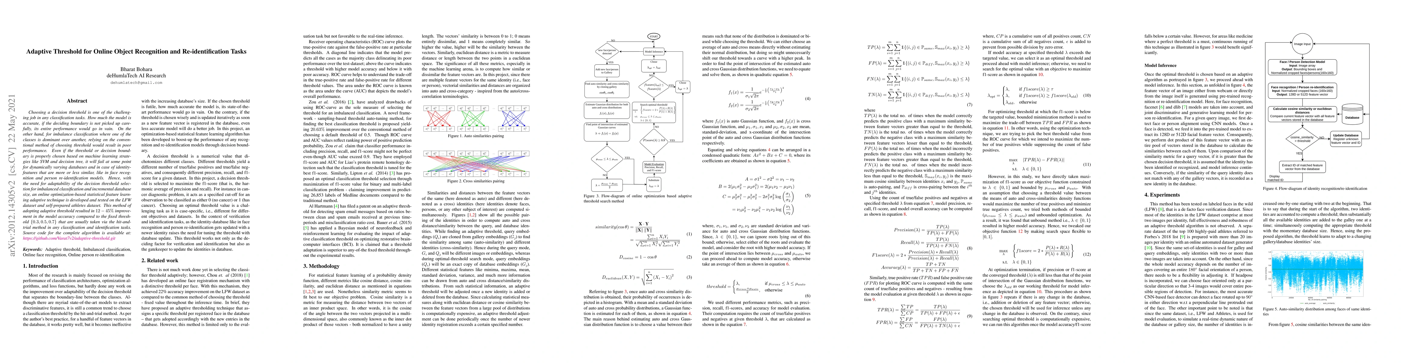 Choosing a decision threshold is one of the challenging job in any classification tasks. How much the model is accurate, if the deciding boundary is not picked up carefully, its entire performance would go in vain. On the other hand, for imbalance classification where one of the classes is dominant over another, relying on the conventional method of choosing threshold would result in poor performance. Even if the threshold or decision boundary is properly chosen based on machine learning strategies like SVM and decision tree, it will fail at some point for dynamically varying databases and in case of identity-features that are more or less similar, like in face recognition and person re-identification models. Hence, with the need for adaptability of the decision threshold selection for imbalanced classification and incremental database size, an online optimization-based statistical feature learning adaptive technique is developed and tested on the LFW datasets and self-prepared athletes datasets. This method of adopting adaptive threshold resulted in 12-45% improvement in the model accuracy compared to the fixed threshold {0.3,0.5,0.7} that are usually taken via the hit-and-trial method in any classification and identification tasks. Source code for the complete algorithm is available at: https://github.com/Varat7v2/adaptive-threshold