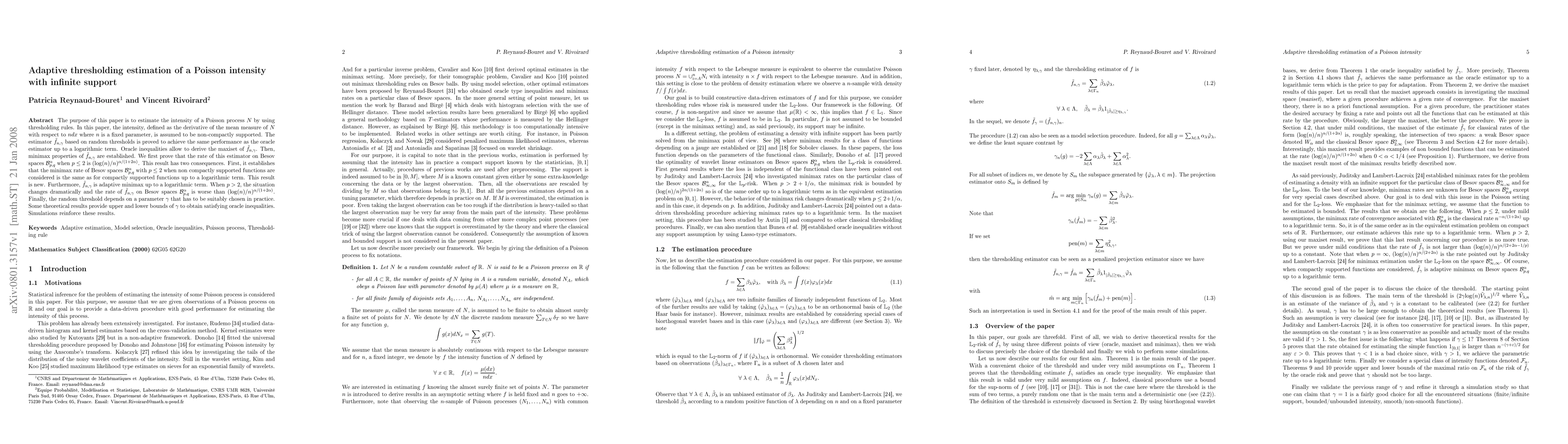 The purpose of this paper is to estimate the intensity of a Poisson process $N$ by using thresholding rules. In this paper, the intensity, defined as the derivative of the mean measure of $N$ with respect to $ndx$ where $n$ is a fixed parameter, is assumed to be non-compactly supported. The estimator $\tilde{f}_{n,\gamma}$ based on random thresholds is proved to achieve the same performance as the oracle estimator up to a logarithmic term. Oracle inequalities allow to derive the maxiset of $\tilde{f}_{n,\gamma}$. Then, minimax properties of $\tilde{f}_{n,\gamma}$ are established. We first prove that the rate of this estimator on Besov spaces ${\cal B}^\al_{p,q}$ when $p\leq 2$ is $(\ln(n)/n)^{\al/(1+2\al)}$. This result has two consequences. First, it establishes that the minimax rate of Besov spaces ${\cal B}^\al_{p,q}$ with $p\leq 2$ when non compactly supported functions are considered is the same as for compactly supported functions up to a logarithmic term. This result is new. Furthermore, $\tilde{f}_{n,\gamma}$ is adaptive minimax up to a logarithmic term. When $p>2$, the situation changes dramatically and the rate of $\tilde{f}_{n,\gamma}$ on Besov spaces ${\cal B}^\al_{p,q}$ is worse than $(\ln(n)/n)^{\al/(1+2\al)}$. Finally, the random threshold depends on a parameter $\gamma$ that has to be suitably chosen in practice. Some theoretical results provide upper and lower bounds of $\gamma$ to obtain satisfying oracle inequalities. Simulations reinforce these results.