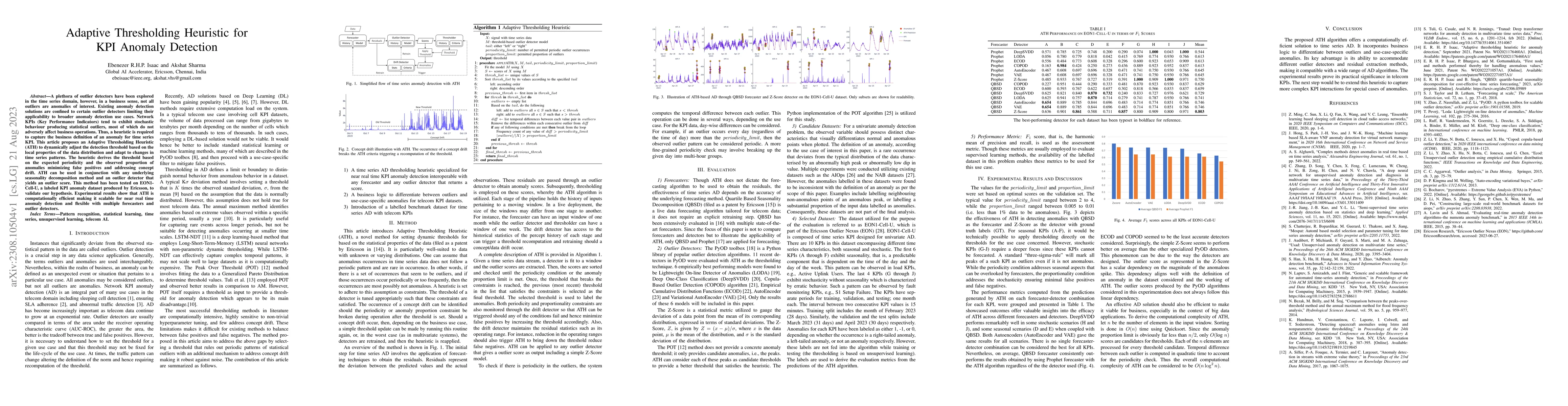 This paper proposes an Adaptive Thresholding Heuristic (ATH) to dynamically adjust thresholds for detecting anomalies in time series KPIs, minimizing false positives and adapting to changes in data patterns. The heuristic is tested on Ericsson's EON1-Cell-U dataset, demonstrating computational efficiency and scalability for real-time anomaly detection.