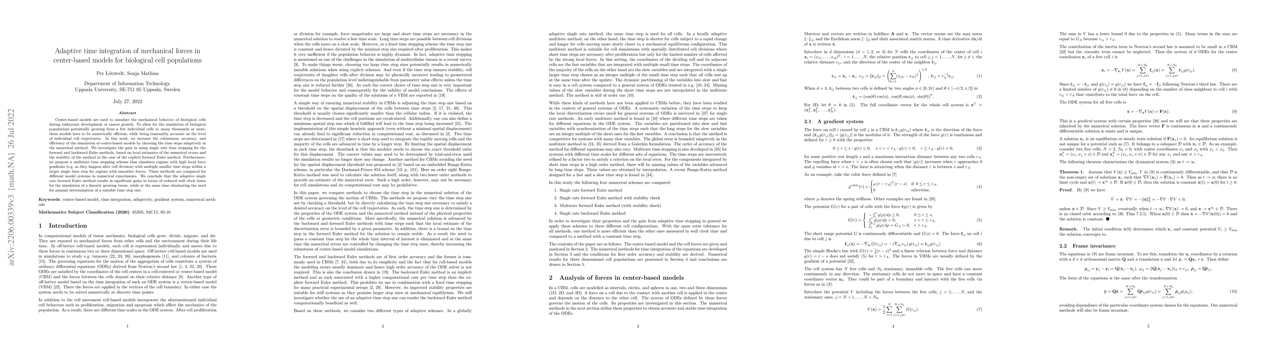This paper proposes adaptive time integration methods to enhance the efficiency and accuracy of center-based models simulating mechanical behaviors in biological cell populations. The adaptive single rate forward Euler method notably reduces simulation times while maintaining accuracy, especially in regions with high force gradients.