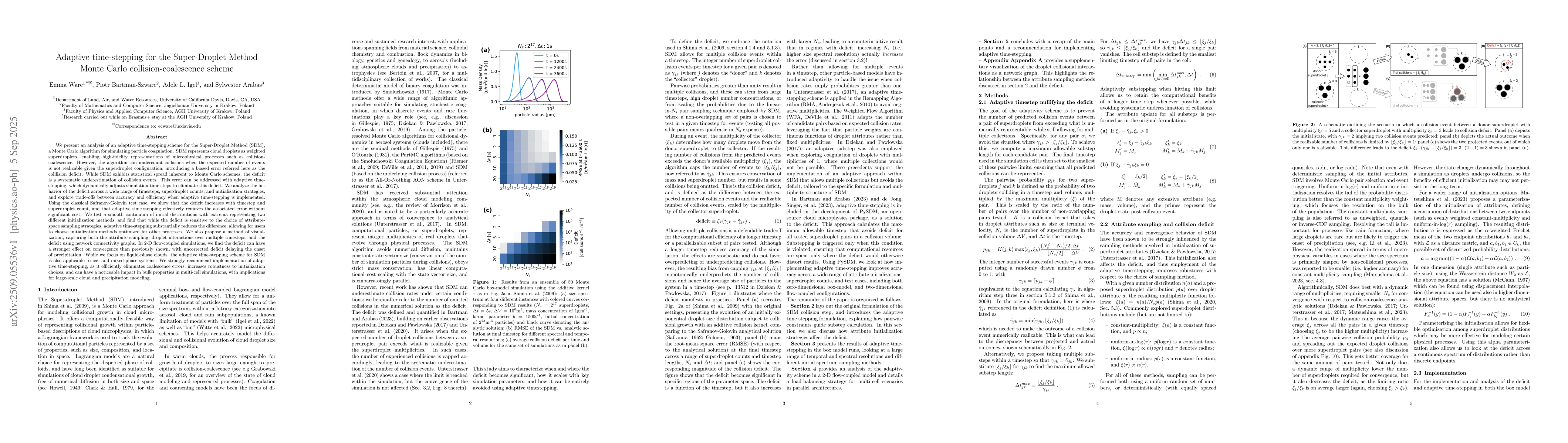 We present an analysis of an adaptive time-stepping scheme for the Super-Droplet Method (SDM), a Monte Carlo algorithm for simulating particle coagulation. SDM represents cloud droplets as weighted superdroplets, enabling high-fidelity representations of microphysical processes such as collision-coalescence. However, the algorithm can undercount collisions when the expected number of events is not realizable given the superdroplet configuration, introducing a biased error referred here as the collision deficit. While SDM exhibits statistical spread inherent to Monte Carlo schemes, the deficit is a systematic underestimation of collision events. This error can be addressed with adaptive time-stepping, which dynamically adjusts simulation time steps to eliminate this deficit. We analyze the behavior of the deficit across a wide range of timesteps, superdroplet counts, and initialization strategies, and explore trade-offs between accuracy and efficiency. Using the classical Safranov-Golovin test case, we show that the deficit increases with timestep and superdroplet count, and that adaptive time-stepping effectively removes the associated error without significant cost. We test a smooth continuum of initial distributions with extrema representing two different initialization methods, and find that while the deficit is sensitive to the choice of attribute-space sampling strategies, adaptive time-stepping substantially reduces the difference, allowing for users to choose initialization methods optimized for other processes. We also propose a method of visualization, capturing both the attribute sampling, droplet interactions over multiple timesteps, and the deficit using network connectivity graphs. In 2-D flow-coupled simulations, we find the deficit can have a stronger effect on convergence than previously shown, with uncorrected deficit delaying the onset of precipitation.