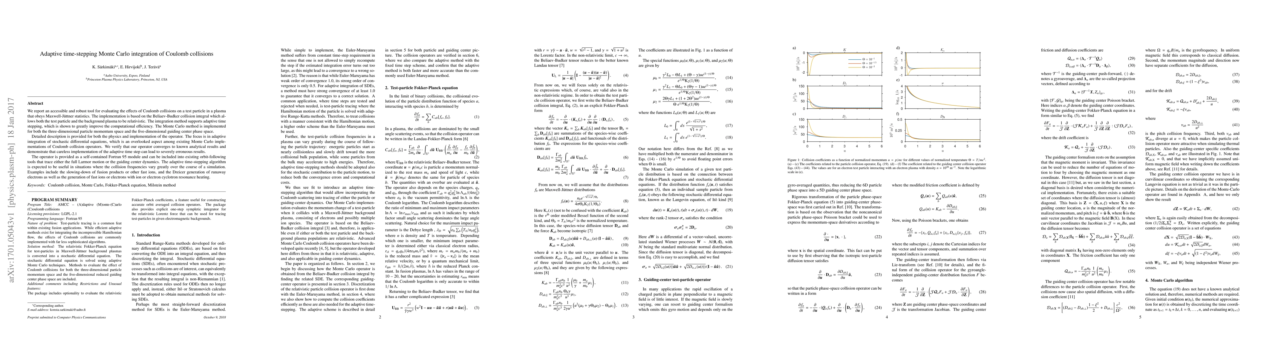 We report an accessible and robust tool for evaluating the effects of Coulomb collisions on a test particle in a plasma that obeys Maxwell-J\"uttner statistics. The implementation is based on the Beliaev-Budker collision integral which allows both the test particle and the background plasma to be relativistic. The integration method supports adaptive time stepping, which is shown to greatly improve the computational efficiency. The Monte Carlo method is implemented for both the three-dimensional particle momentum space and the five-dimensional guiding center phase space. Detailed description is provided for both the physics and implementation of the operator. The focus is in adaptive integration of stochastic differential equations, which is an overlooked aspect among existing Monte Carlo implementations of Coulomb collision operators. We verify that our operator converges to known analytical results and demonstrate that careless implementation of the adaptive time step can lead to severely erroneous results. The operator is provided as a self-contained Fortran 95 module and can be included into existing orbit-following tools that trace either the full Larmor motion or the guiding center dynamics. The adaptive time-stepping algorithm is expected to be useful in situations where the collision frequencies vary greatly over the course of a simulation. Examples include the slowing-down of fusion products or other fast ions, and the Dreicer generation of runaway electrons as well as the generation of fast ions or electrons with ion or electron cyclotron resonance heating.