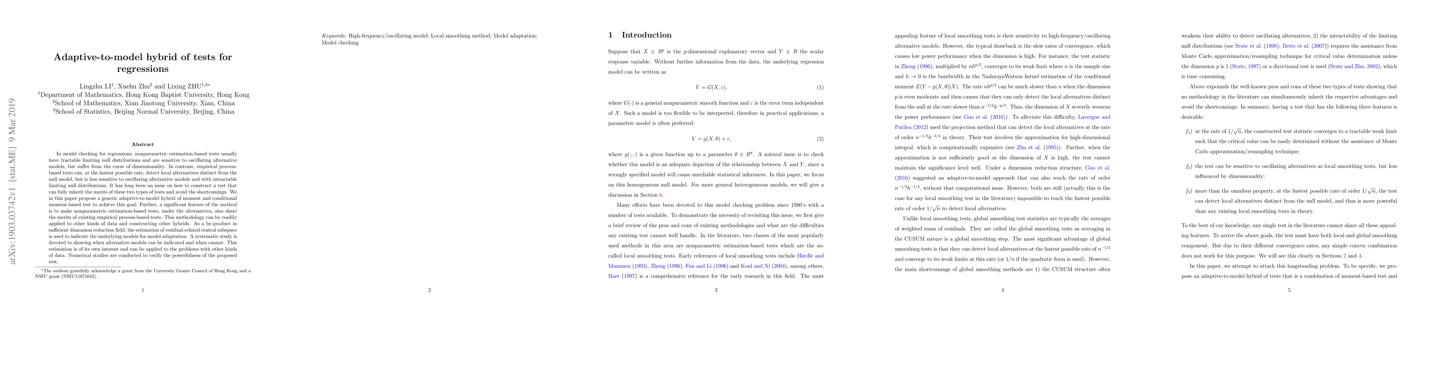 In model checking for regressions, nonparametric estimation-based tests usually have tractable limiting null distributions and are sensitive to oscillating alternative models, but suffer from the curse of dimensionality. In contrast, empirical process-based tests can, at the fastest possible rate, detect local alternatives distinct from the null model, but is less sensitive to oscillating alternative models and with intractable limiting null distributions. It has long been an issue on how to construct a test that can fully inherit the merits of these two types of tests and avoid the shortcomings. We in this paper propose a generic adaptive-to-model hybrid of moment and conditional moment-based test to achieve this goal. Further, a significant feature of the method is to make nonparametric estimation-based tests, under the alternatives, also share the merits of existing empirical process-based tests. This methodology can be readily applied to other kinds of data and constructing other hybrids. As a by-product in sufficient dimension reduction field, the estimation of residual-related central subspace is used to indicate the underlying models for model adaptation. A systematic study is devoted to showing when alternative models can be indicated and when cannot. This estimation is of its own interest and can be applied to the problems with other kinds of data. Numerical studies are conducted to verify the powerfulness of the proposed test.