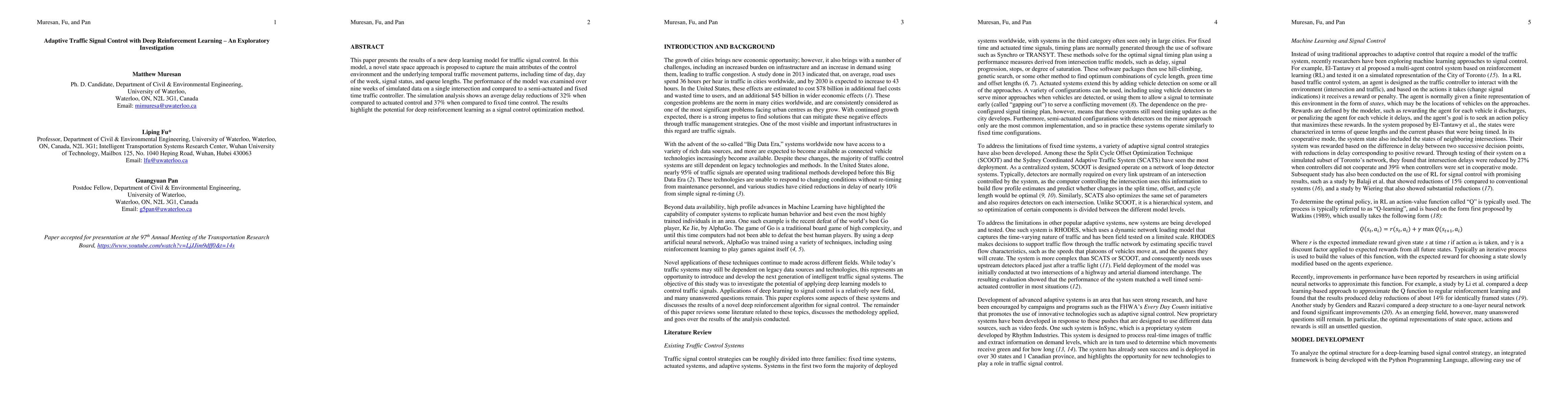 This paper explores a deep reinforcement learning model for adaptive traffic signal control, demonstrating a 32% average delay reduction compared to semi-actuated control and 37% compared to fixed time control over nine weeks of simulated data. The model captures temporal traffic patterns and shows promise for optimizing signal control.