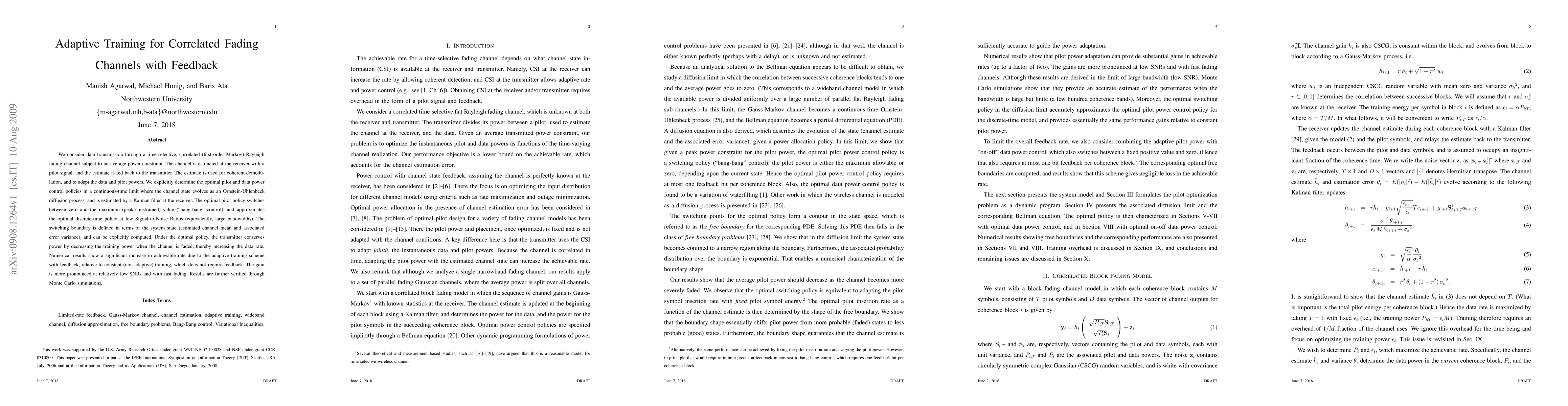 This paper investigates adaptive training strategies for data transmission over correlated Rayleigh fading channels, optimizing pilot and data power control to enhance data rates. The optimal adaptive training policy, derived using a continuous-time model and Kalman filter, significantly boosts achievable rates, especially under low SNRs and fast fading conditions, compared to non-adaptive training.
