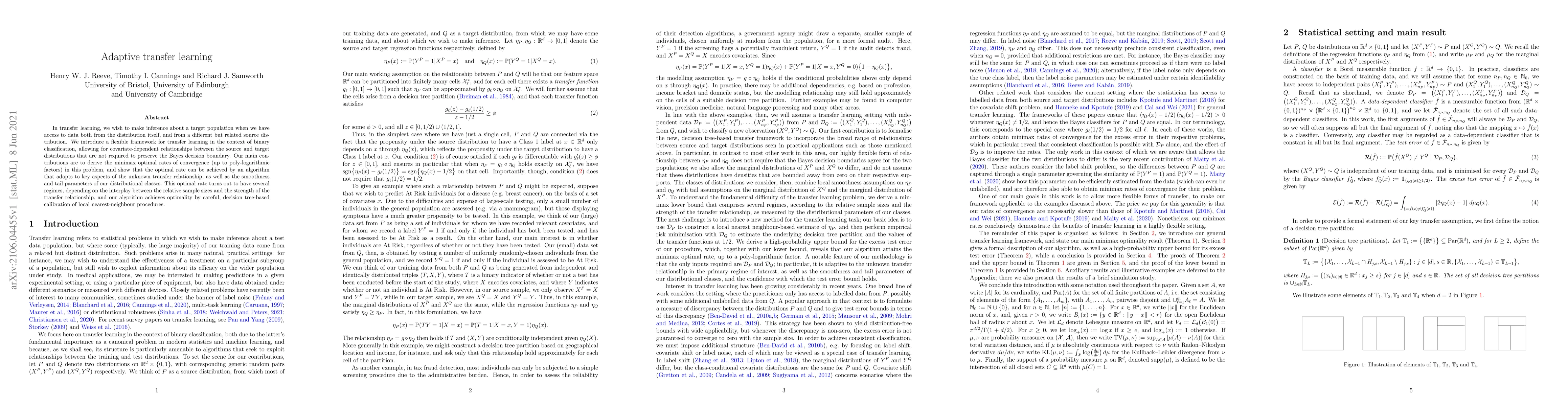 This paper introduces a framework for adaptive transfer learning in binary classification, deriving minimax optimal convergence rates and presenting an algorithm that adapts to the transfer relationship's specifics and distributional smoothness. The algorithm achieves optimal performance through a decision tree-based calibration of local nearest-neighbour methods.