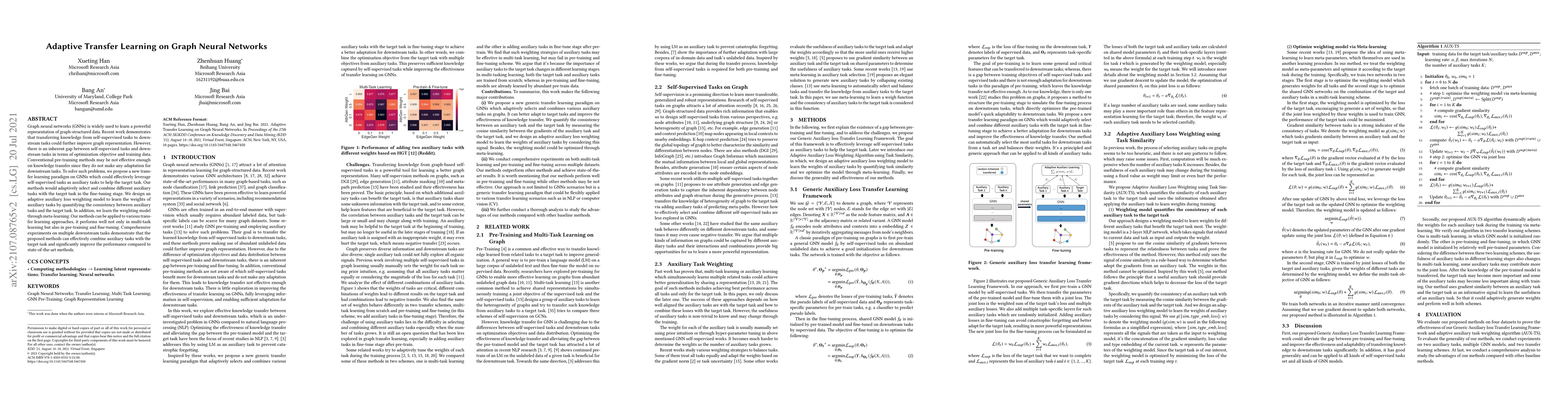 This paper proposes an adaptive transfer learning paradigm for graph neural networks (GNNs) that leverages self-supervised tasks to enhance downstream tasks. The method adaptively selects and combines auxiliary tasks during fine-tuning, employing an adaptive loss weighting model to optimize performance, and demonstrates significant improvements over state-of-the-art methods.