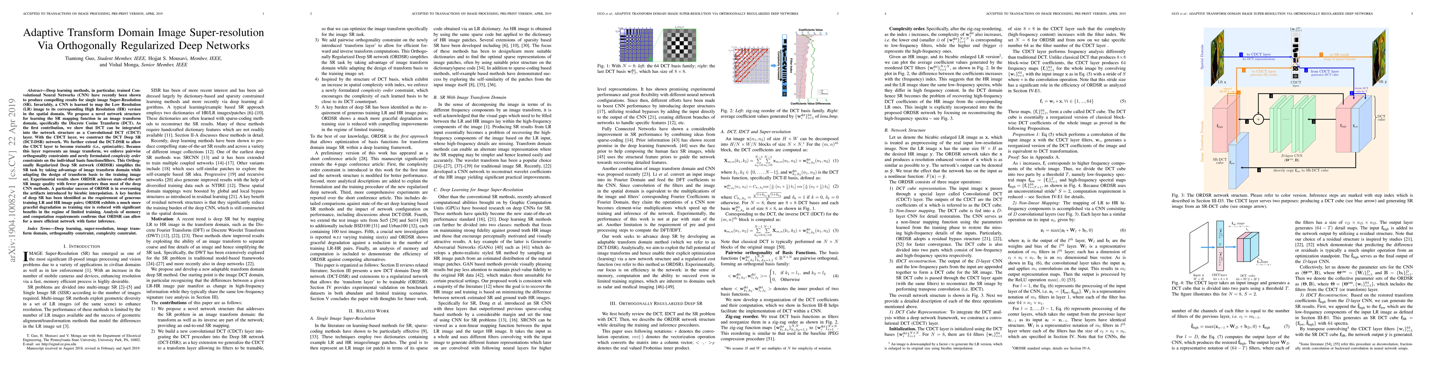 This paper proposes an Orthogonally Regularized Deep SR (ORDSR) network for image super-resolution, utilizing a Convolutional DCT (CDCT) layer in the transform domain. The method enforces orthogonality and complexity order constraints on the transform basis, achieving state-of-the-art image quality with fewer parameters and better performance under limited training conditions.