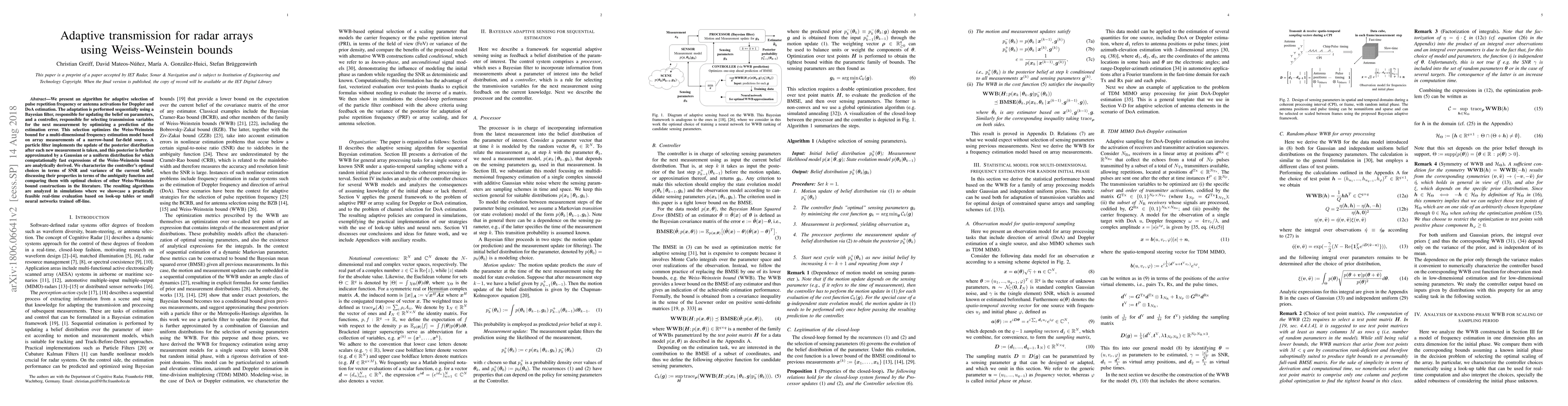 This paper proposes an adaptive algorithm for radar arrays that optimizes pulse repetition frequency and antenna activations using Weiss-Weinstein bounds to enhance Doppler and direction-of-arrival (DoA) estimation. The algorithm employs a Bayesian filter and controller to sequentially update parameter beliefs and select transmission variables, achieving real-time performance through efficient look-up tables or small neural networks.
