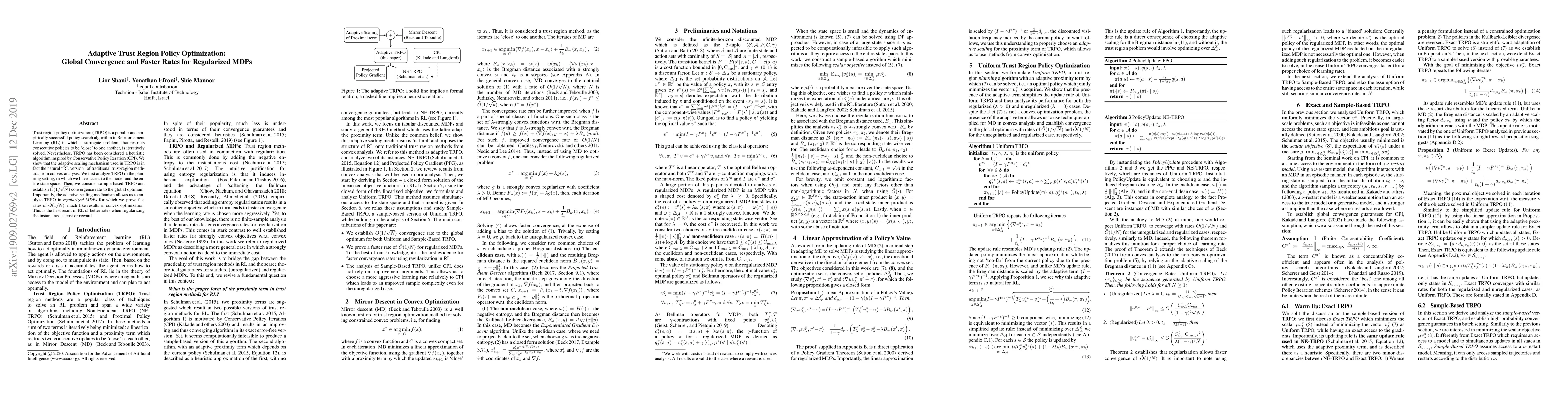 This research paper shows that Trust Region Policy Optimization (TRPO) has a natural connection to traditional trust-region methods from convex analysis, leading to improved convergence rates in regularized MDPs.