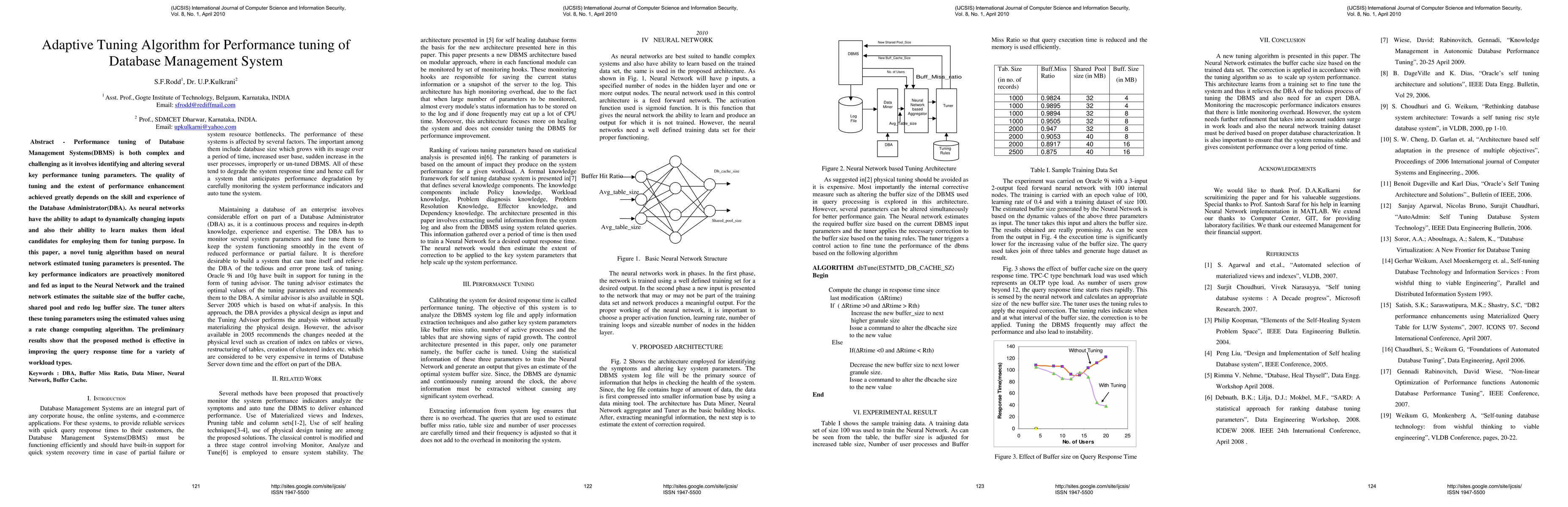 This paper introduces a novel adaptive tuning algorithm leveraging neural networks to optimize key performance parameters in Database Management Systems. The algorithm proactively monitors key indicators and uses a trained neural network to estimate optimal buffer cache, shared pool, and redo log buffer sizes, demonstrating improved query response times across various workloads.