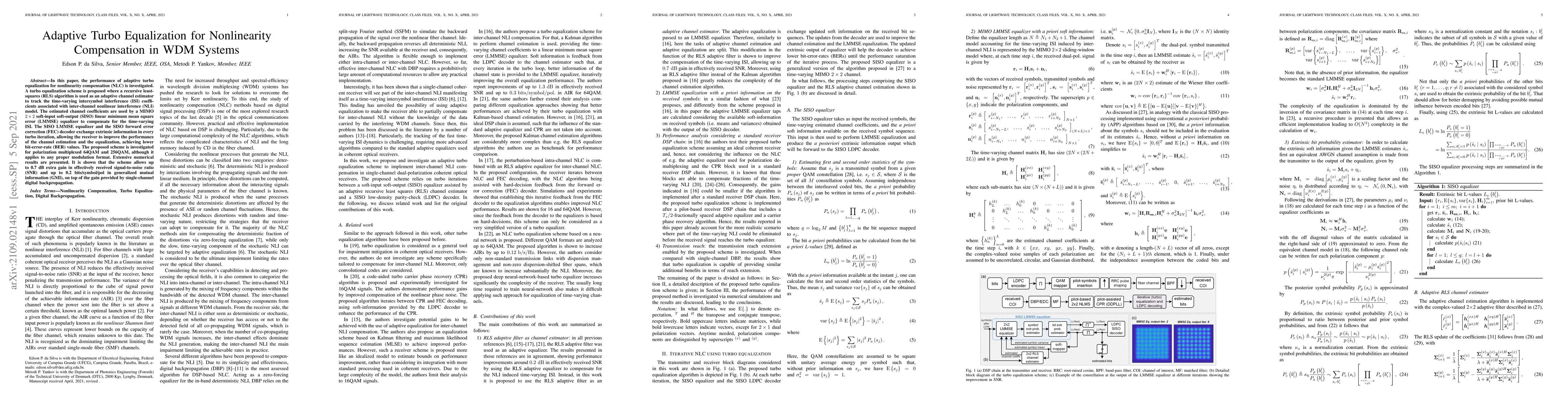 This paper proposes an adaptive turbo equalization scheme using an RLS algorithm for nonlinearity compensation in WDM systems, achieving improved performance through iterative exchange of extrinsic information between a MIMO LMMSE equalizer and a FEC decoder, resulting in up to 0.7 dB extra SNR gain and 0.2 bits/symbol/pol in GMI.