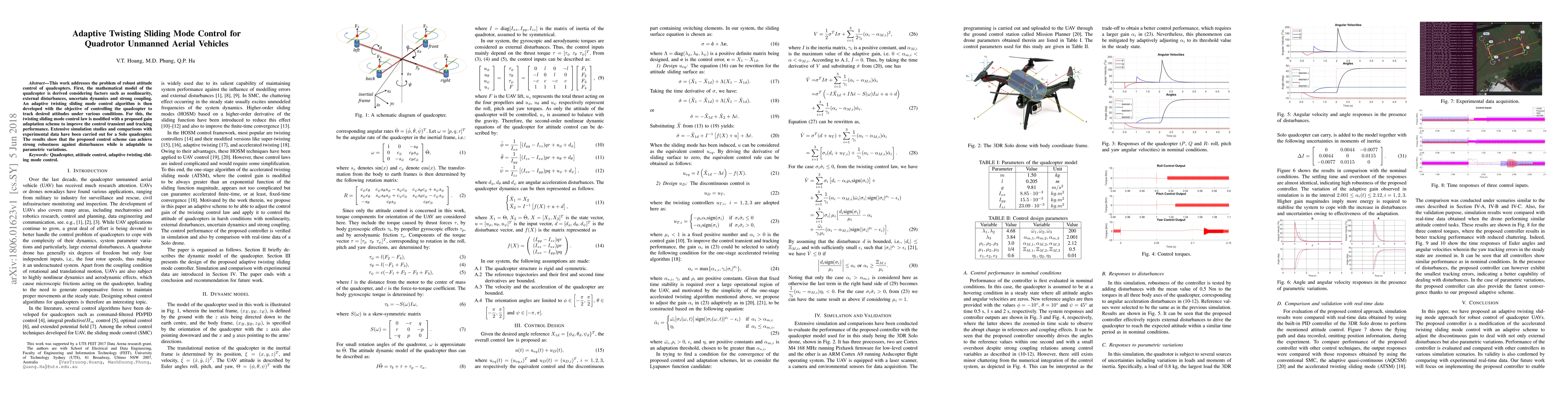The paper presents an adaptive twisting sliding mode control algorithm with an adaptive gain adjustment scheme for robust attitude control of quadrotor UAVs, addressing nonlinearity, external disturbances, uncertain dynamics, and strong coupling.