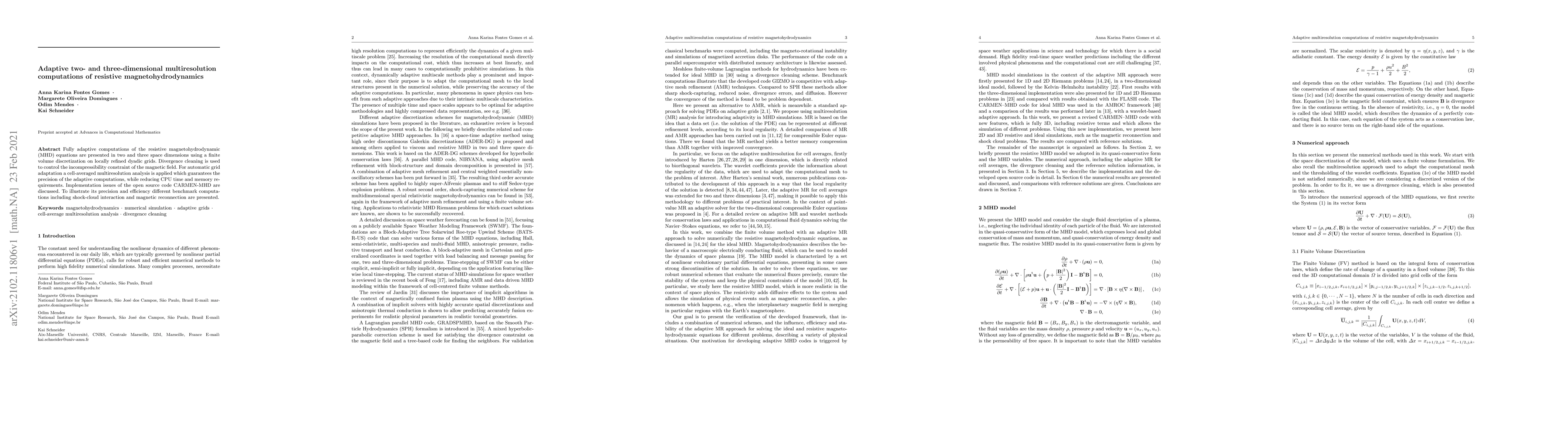 This paper presents adaptive multiresolution computations for resistive magnetohydrodynamics in 2D and 3D using finite volume methods on locally refined grids, with divergence cleaning for magnetic field incompressibility. The method employs cell-averaged multiresolution analysis to ensure precision while optimizing computational resources, and demonstrates its efficiency through benchmark simulations.