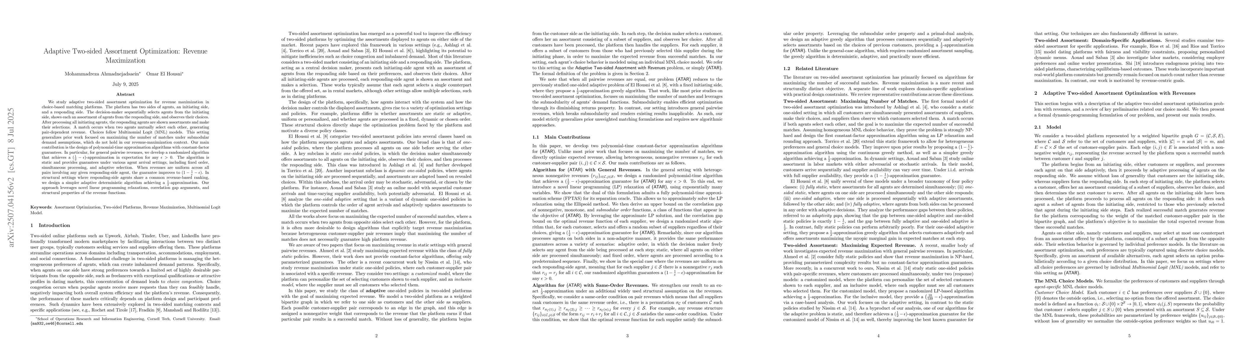 We study adaptive two-sided assortment optimization for revenue maximization in choice-based matching platforms. The platform has two sides of agents, an initiating side, and a responding side. The decision-maker sequentially selects agents from the initiating side, shows each an assortment of agents from the responding side, and observes their choices. After processing all initiating agents, the responding agents are shown assortments and make their selections. A match occurs when two agents mutually select each other, generating pair-dependent revenue. Choices follow Multinomial Logit (MNL) models. This setting generalizes prior work focused on maximizing the number of matches under submodular demand assumptions, which do not hold in our revenue-maximization context. Our main contribution is the design of polynomial-time approximation algorithms with constant-factor guarantees. In particular, for general pairwise revenues, we develop a randomized algorithm that achieves a $(\frac{1}{2} - \epsilon)$-approximation in expectation for any $\epsilon > 0$. The algorithm is static and provides guarantees under various agent arrival settings, including fixed order, simultaneous processing, and adaptive selection. When revenues are uniform across all pairs involving any given responding-side agent, the guarantee improves to $(1 - \frac{1}{e} - \epsilon)$. In structural settings where responding-side agents share a common revenue-based ranking, we design a simpler adaptive deterministic algorithm achieving a $\frac{1}{2}$-approximation. Our approach leverages novel linear programming relaxations, correlation gap arguments, and structural properties of the revenue functions.