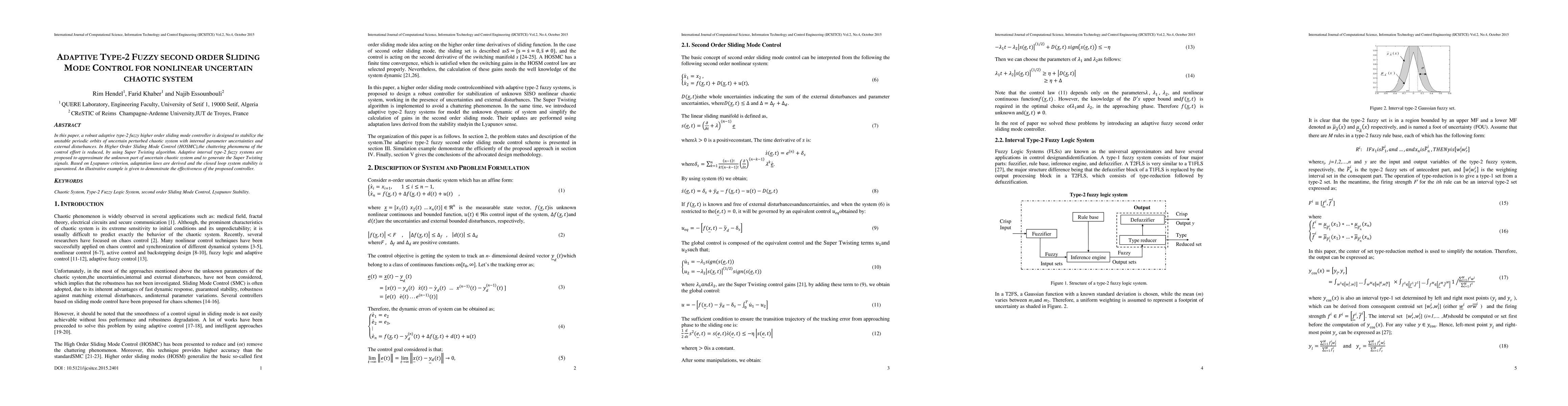 In this paper, a robust adaptive type-2 fuzzy higher order sliding mode controller is designed to stabilize the unstable periodic orbits of uncertain perturbed chaotic system with internal parameter uncertainties and external disturbances. In Higher Order Sliding Mode Control (HOSMC),the chattering phenomena of the control effort is reduced, by using Super Twisting algorithm. Adaptive interval type-2 fuzzy systems are proposed to approximate the unknown part of uncertain chaotic system and to generate the Super Twisting signals. Based on Lyapunov criterion, adaptation laws are derived and the closed loop system stability is guaranteed. An illustrative example is given to demonstrate the effectiveness of the proposed controller.