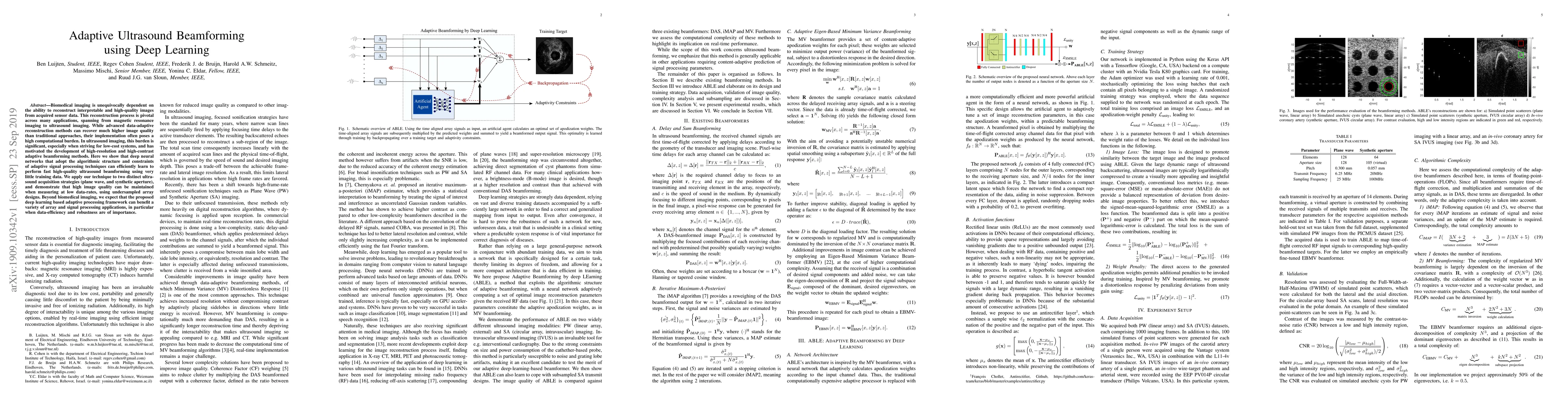 This paper proposes a deep learning approach for adaptive ultrasound beamforming that efficiently reconstructs high-quality images from limited training data, reducing computational burden and enabling low-cost systems. The method is demonstrated to work effectively with both plane wave and synthetic aperture acquisition strategies.