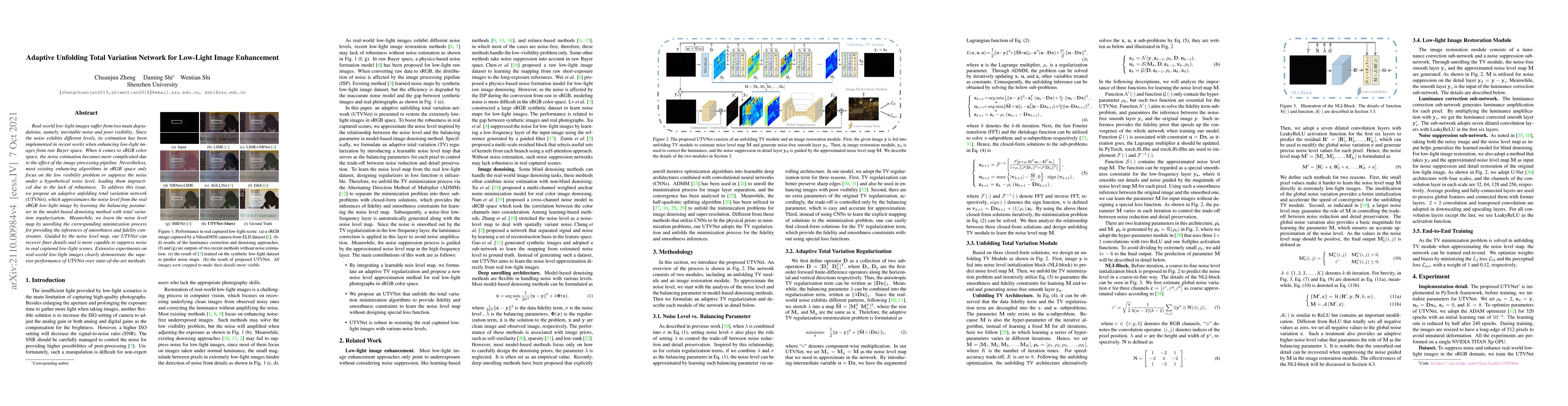 The paper proposes an Adaptive Unfolding Total Variation Network (UTVNet) to enhance low-light images by estimating noise levels in sRGB color space, balancing noise suppression and visibility recovery. UTVNet outperforms existing methods by learning noise level maps and providing better detail recovery and noise suppression.