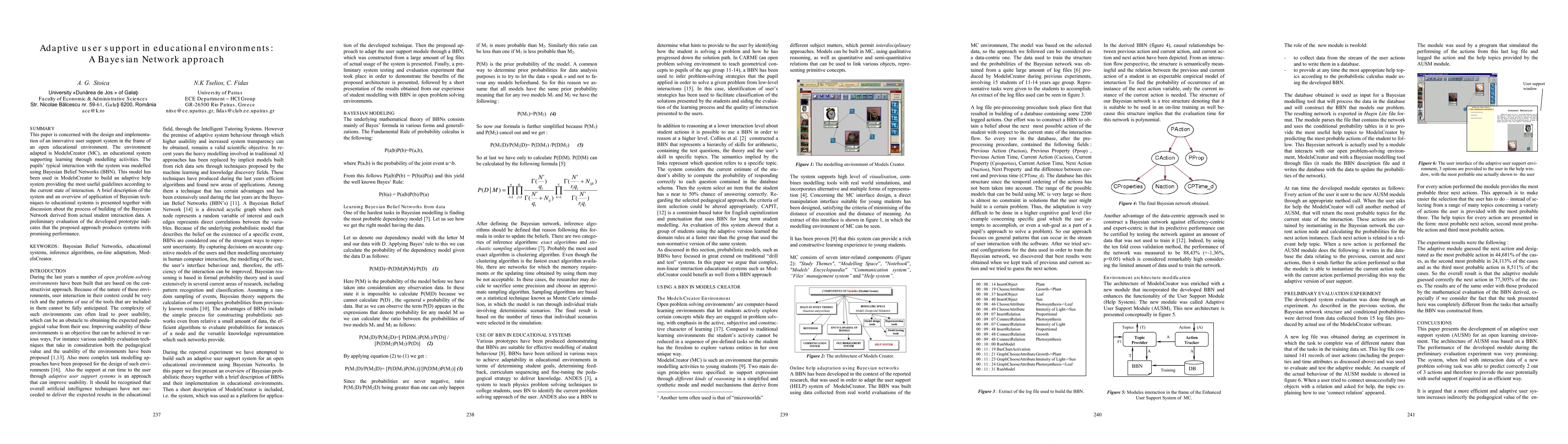This paper introduces an adaptive user support system in the educational environment ModelsCreator, utilizing Bayesian Belief Networks to model student interactions and provide tailored guidance. Preliminary evaluation suggests the approach yields promising results in enhancing educational support.