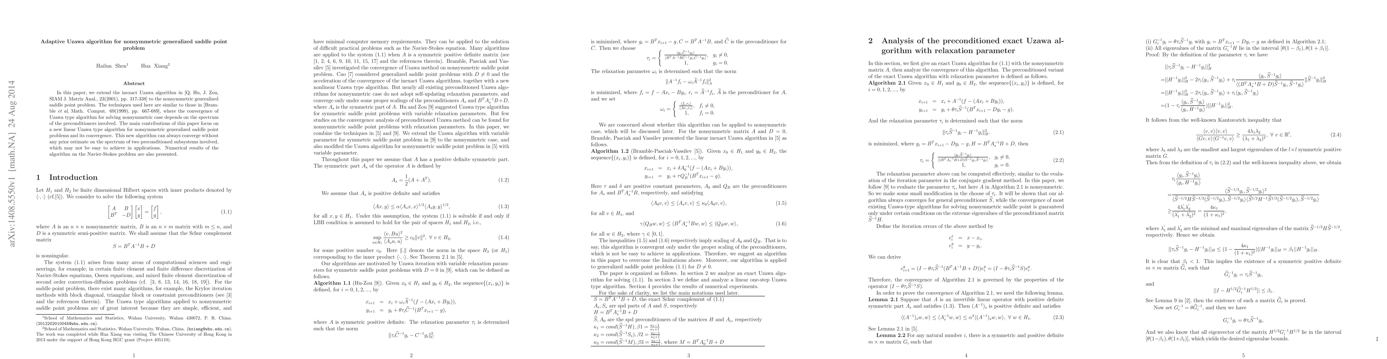 This paper introduces an adaptive Uzawa algorithm for solving nonsymmetric generalized saddle point problems, extending previous inexact Uzawa methods. Unlike prior algorithms, this new approach guarantees convergence without requiring prior knowledge of the spectrum of preconditioners, and is demonstrated through numerical results on the Navier-Stokes problem.