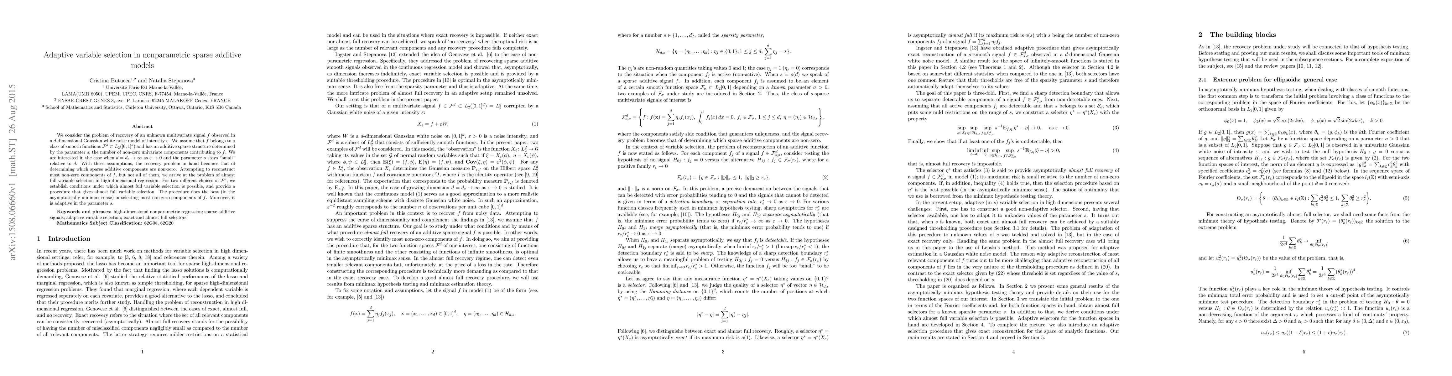 This paper develops an adaptive variable selection method for recovering sparse additive components in high-dimensional nonparametric regression models. It establishes conditions for almost full variable selection and provides a procedure that performs optimally in selecting most non-zero components, adapting to the sparsity level.