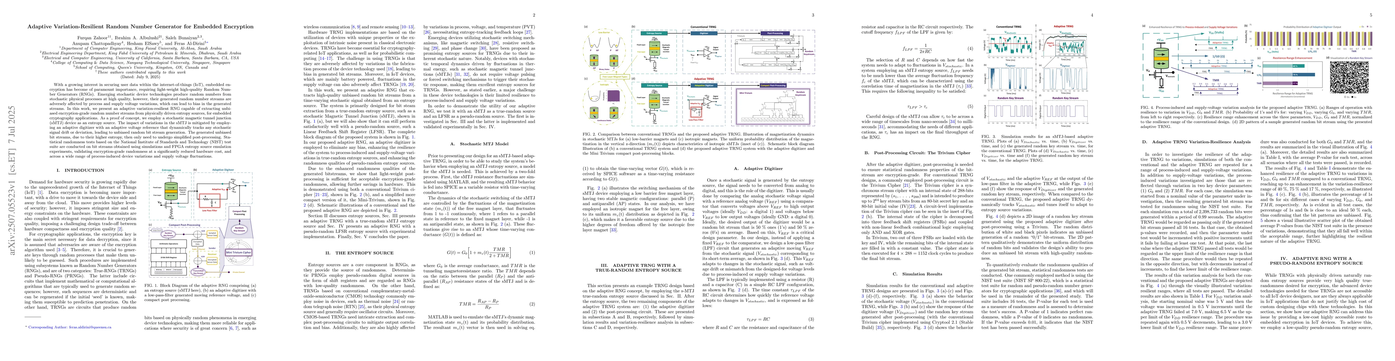 With a growing interest in securing user data within the internet-of-things (IoT), embedded encryption has become of paramount importance, requiring light-weight high-quality Random Number Generators (RNGs). Emerging stochastic device technologies produce random numbers from stochastic physical processes at high quality, however, their generated random number streams are adversely affected by process and supply voltage variations, which can lead to bias in the generated streams. In this work, we present an adaptive variation-resilient RNG capable of extracting unbiased encryption-grade random number streams from physically driven entropy sources, for embedded cryptography applications. As a proof of concept, we employ a stochastic magnetic tunnel junction (sMTJ) device as an entropy source. The impact of variations in the sMTJ is mitigated by employing an adaptive digitizer with an adaptive voltage reference that dynamically tracks any stochastic signal drift or deviation, leading to unbiased random bit stream generation. The generated unbiased bit streams, due to their higher entropy, then only need to undergo simplified post-processing. Statistical randomness tests based on the National Institute of Standards and Technology (NIST) test suite are conducted on bit streams obtained using simulations and FPGA entropy source emulation experiments, validating encryption-grade randomness at a significantly reduced hardware cost, and across a wide range of process-induced device variations and supply voltage fluctuations.