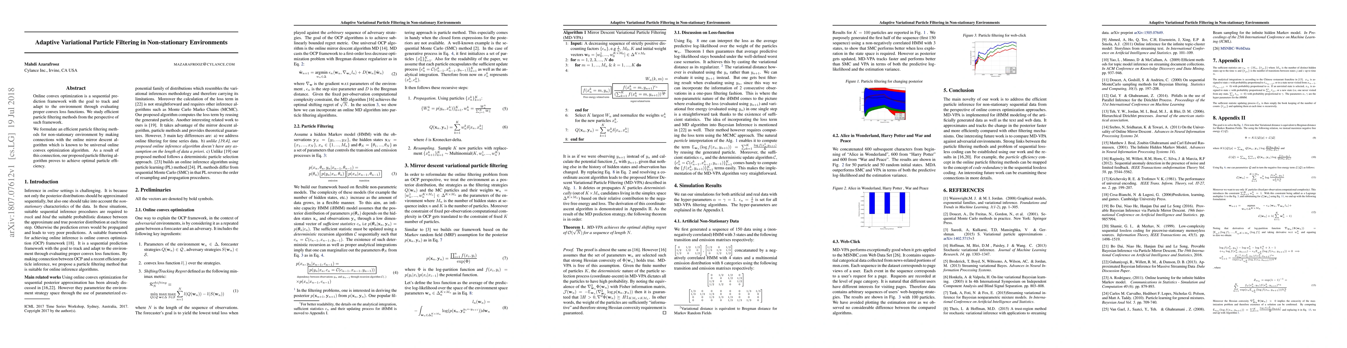 This paper proposes an adaptive variational particle filtering method for non-stationary environments, leveraging the online mirror descent algorithm for optimal particle efficiency and effective adaptation to changing conditions. The method achieves optimal performance through its connection to universal online convex optimization.