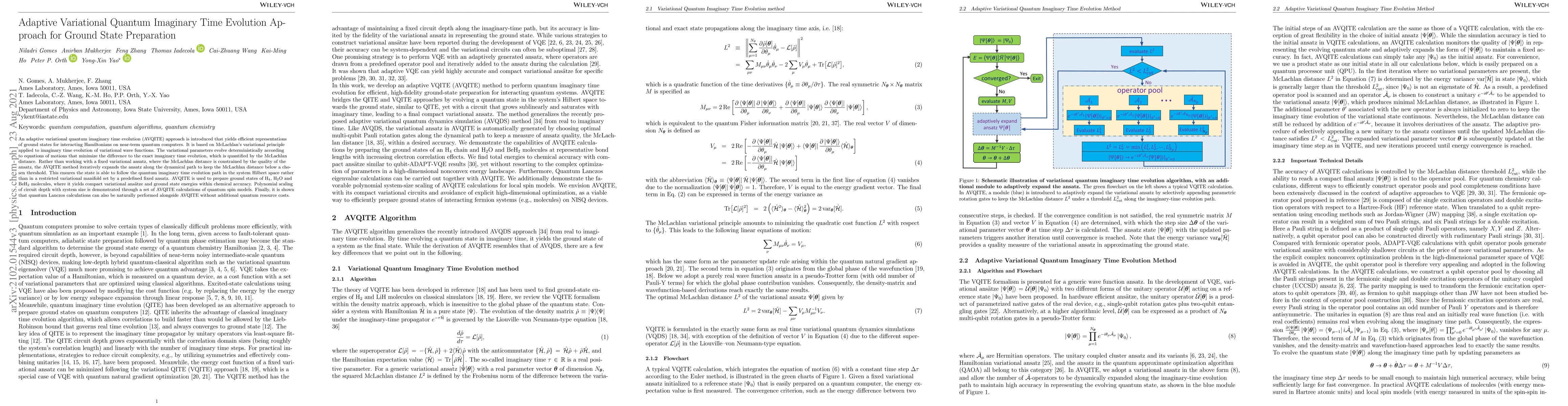 This paper introduces an adaptive variational quantum imaginary time evolution (AVQITE) approach for preparing ground states of interacting Hamiltonians on near-term quantum computers, achieving efficient representations and compact variational ansätze. The method dynamically expands variational ansätze to maintain accuracy, demonstrating effectiveness on molecules and spin models with polynomial scaling in circuit depth.