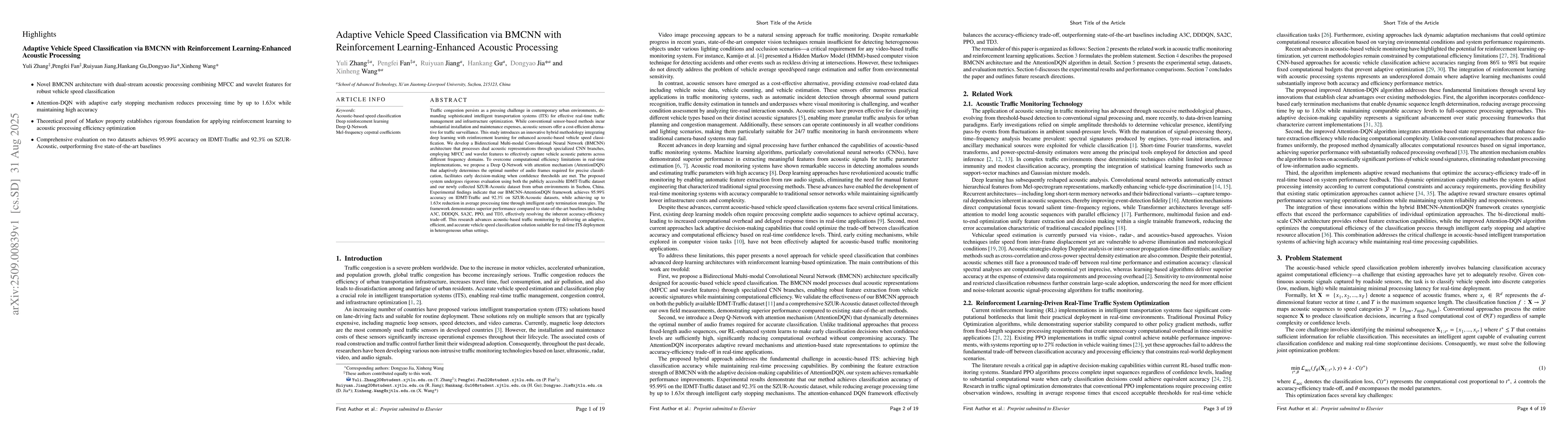 Traffic congestion remains a pressing urban challenge, requiring intelligent transportation systems for real-time management. We present a hybrid framework that combines deep learning and reinforcement learning for acoustic vehicle speed classification. A dual-branch BMCNN processes MFCC and wavelet features to capture complementary frequency patterns. An attention-enhanced DQN adaptively selects the minimal number of audio frames and triggers early decisions once confidence thresholds are reached. Evaluations on IDMT-Traffic and our SZUR-Acoustic (Suzhou) datasets show 95.99% and 92.3% accuracy, with up to 1.63x faster average processing via early termination. Compared with A3C, DDDQN, SA2C, PPO, and TD3, the method provides a superior accuracy-efficiency trade-off and is suitable for real-time ITS deployment in heterogeneous urban environments.