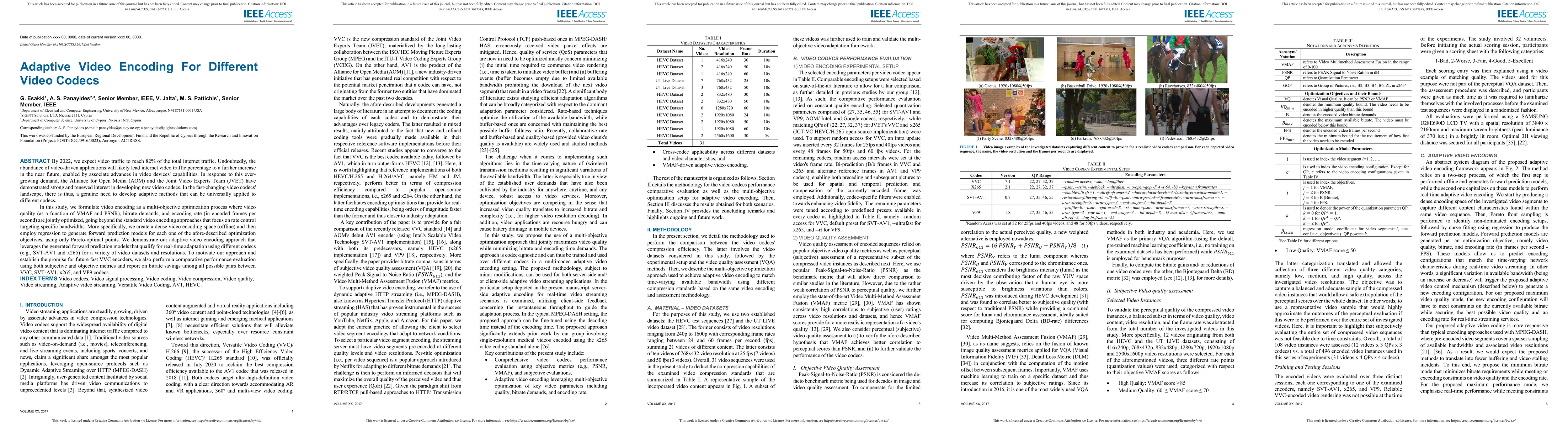 This study develops adaptive video encoding methods that optimize video quality, bitrate, and encoding rate for various video codecs through a multi-objective optimization framework. The approach uses regression to create prediction models based on Pareto-optimal points, enabling real-time adaptation across different codecs and demonstrating bitrate savings in comparative evaluations.