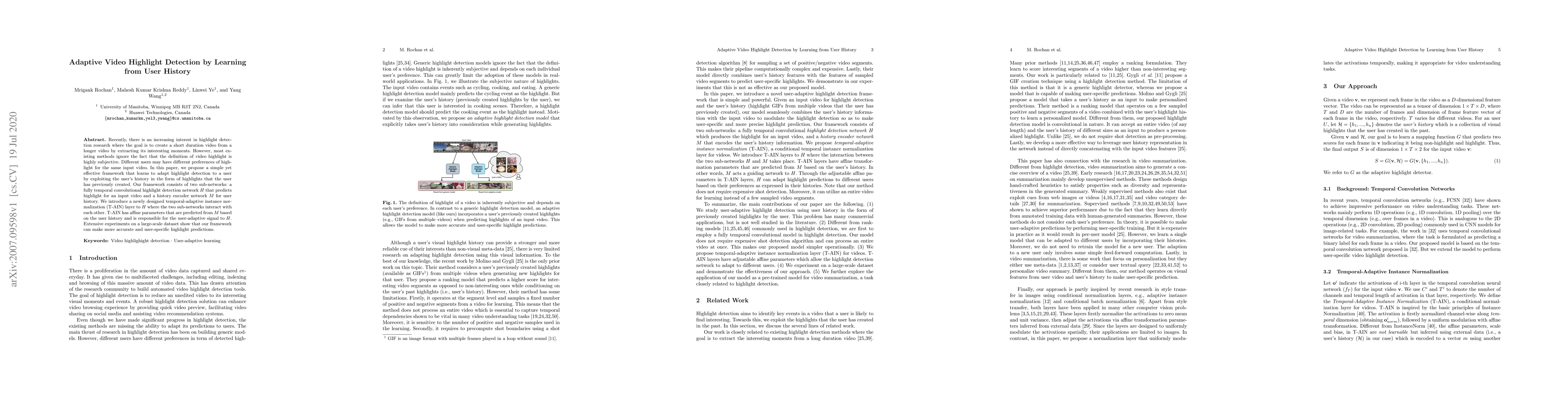 This paper proposes a framework for adaptive video highlight detection that learns from a user's history to create personalized video highlights. The framework combines a temporal convolutional highlight detection network with a user history encoder, utilizing a temporal-adaptive instance normalization layer to enhance user-specific highlight predictions.