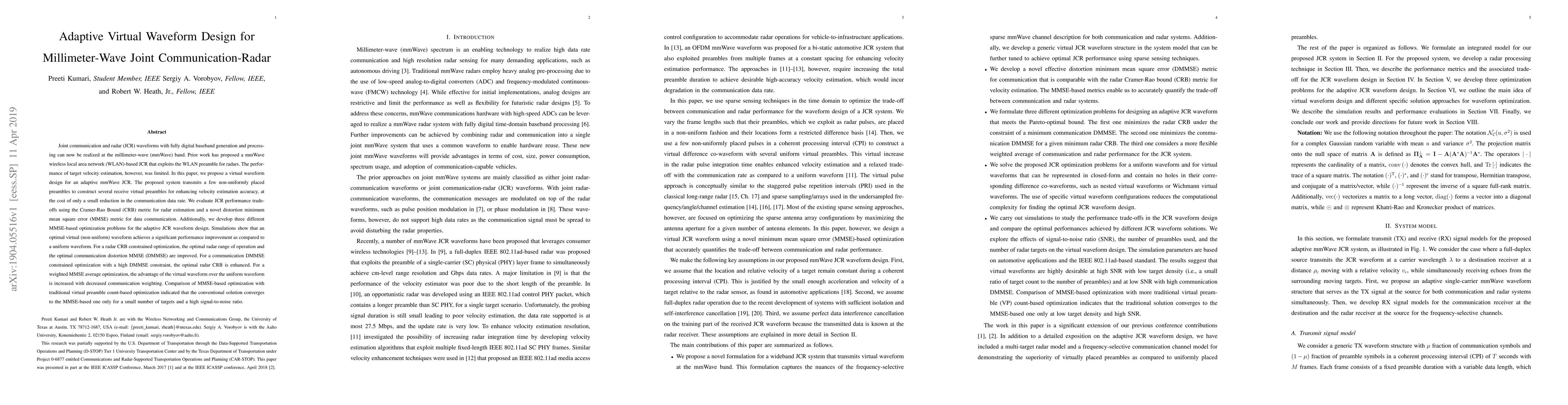 Joint communication and radar (JCR) waveforms with fully digital baseband generation and processing can now be realized at the millimeter-wave (mmWave) band. Prior work has proposed a mmWave wireless local area network (WLAN)-based JCR that exploits the WLAN preamble for radars. The performance of target velocity estimation, however, was limited. In this paper, we propose a virtual waveform design for an adaptive mmWave JCR. The proposed system transmits a few non-uniformly placed preambles to construct several receive virtual preambles for enhancing velocity estimation accuracy, at the cost of only a small reduction in the communication data rate. We evaluate JCR performance trade-offs using the Cramer-Rao Bound (CRB) metric for radar estimation and a novel distortion minimum mean square error (MMSE) metric for data communication. Additionally, we develop three different MMSE-based optimization problems for the adaptive JCR waveform design. Simulations show that an optimal virtual (non-uniform) waveform achieves a significant performance improvement as compared to a uniform waveform. For a radar CRB constrained optimization, the optimal radar range of operation and the optimal communication distortion MMSE (DMMSE) are improved. For a communication DMMSE constrained optimization with a high DMMSE constraint, the optimal radar CRB is enhanced. For a weighted MMSE average optimization, the advantage of the virtual waveform over the uniform waveform is increased with decreased communication weighting. Comparison of MMSE-based optimization with traditional virtual preamble count-based optimization indicated that the conventional solution converges to the MMSE-based one only for a small number of targets and a high signal-to-noise ratio.