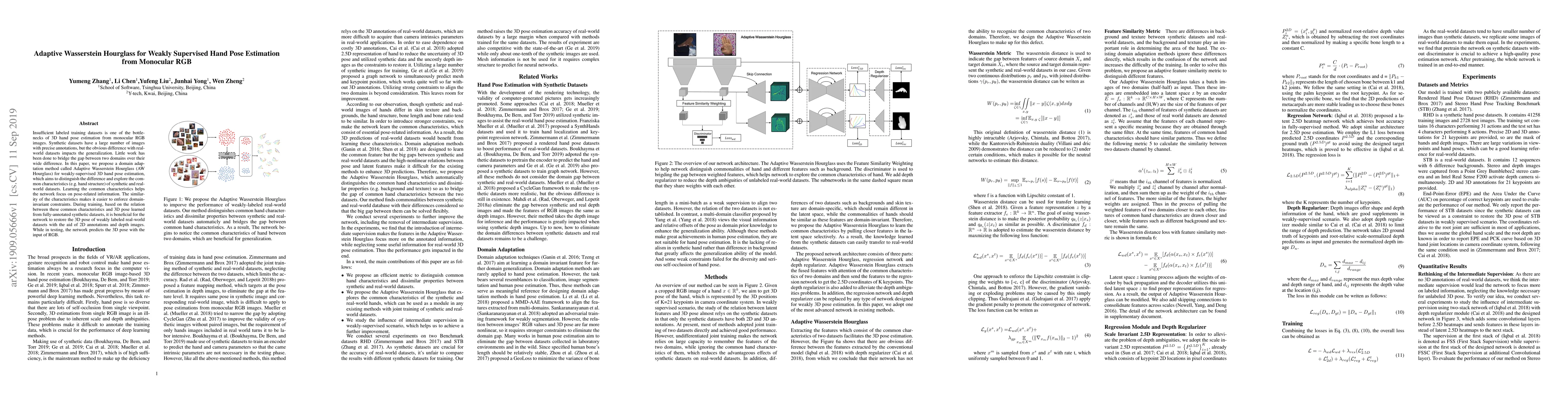 This paper proposes an Adaptive Wasserstein Hourglass (AW Hourglass) method for weakly-supervised 3D hand pose estimation from monocular RGB images, addressing the challenge of insufficient labeled training data. The method aims to bridge the gap between synthetic and real-world datasets by focusing on common hand structure characteristics, facilitating domain-invariant learning and improving pose estimation from weakly-labeled real-world data.