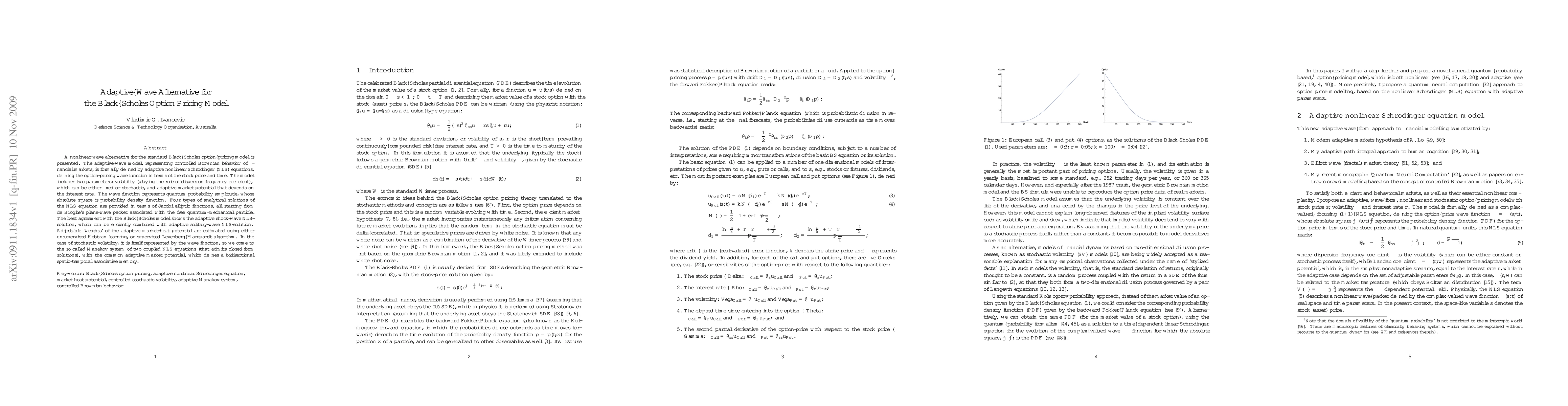 A nonlinear wave alternative for the standard Black-Scholes option-pricing model is presented. The adaptive-wave model, representing 'controlled Brownian behavior' of financial markets, is formally defined by adaptive nonlinear Schr\"odinger (NLS) equations, defining the option-pricing wave function in terms of the stock price and time. The model includes two parameters: volatility (playing the role of dispersion frequency coefficient), which can be either fixed or stochastic, and adaptive market potential that depends on the interest rate. The wave function represents quantum probability amplitude, whose absolute square is probability density function. Four types of analytical solutions of the NLS equation are provided in terms of Jacobi elliptic functions, all starting from de Broglie's plane-wave packet associated with the free quantum-mechanical particle. The best agreement with the Black-Scholes model shows the adaptive shock-wave NLS-solution, which can be efficiently combined with adaptive solitary-wave NLS-solution. Adjustable 'weights' of the adaptive market-heat potential are estimated using either unsupervised Hebbian learning, or supervised Levenberg-Marquardt algorithm. In the case of stochastic volatility, it is itself represented by the wave function, so we come to the so-called Manakov system of two coupled NLS equations (that admits closed-form solutions), with the common adaptive market potential, which defines a bidirectional spatio-temporal associative memory. Keywords: Black-Scholes option pricing, adaptive nonlinear Schr\"odinger equation, market heat potential, controlled stochastic volatility, adaptive Manakov system, controlled Brownian behavior