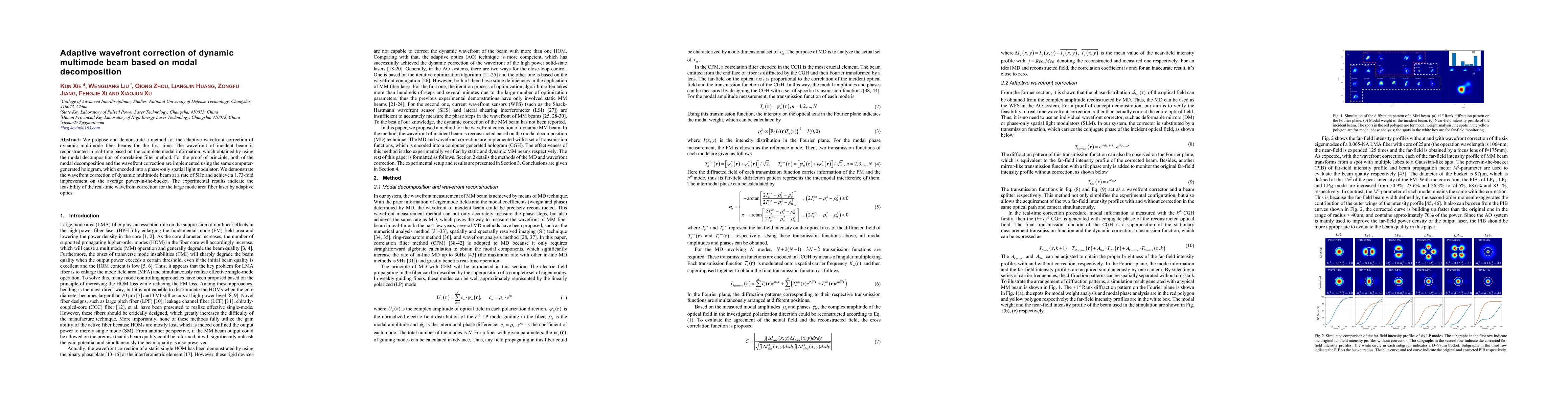 This paper introduces a novel method for adaptive wavefront correction of dynamic multimode fiber beams using real-time modal decomposition and computer-generated holograms. The technique achieves a 1.73-fold improvement in average power-in-the-bucket, demonstrating the potential of adaptive optics for real-time correction in large mode area fiber lasers.