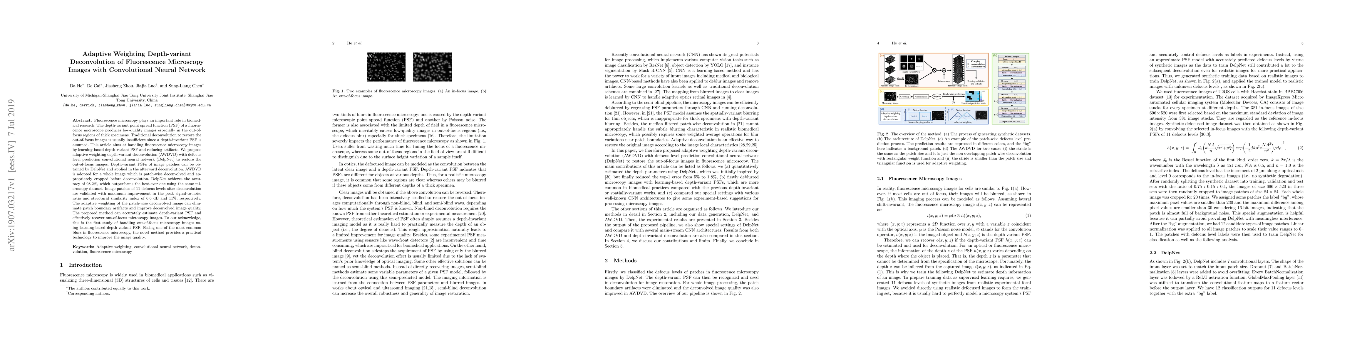 This paper proposes an adaptive weighting depth-variant deconvolution method using a convolutional neural network (DelpNet) to restore out-of-focus fluorescence microscopy images. The method effectively estimates depth-variant PSFs and significantly improves image quality, achieving a peak signal-to-noise ratio and structural similarity index improvement of 6.6 dB and 11%, respectively.