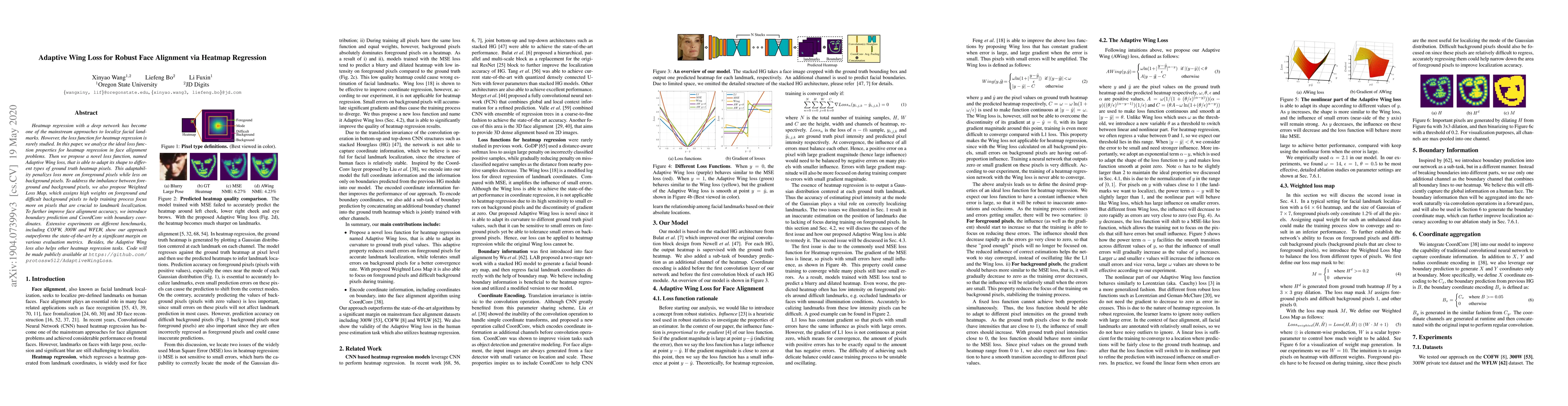 This paper proposes an Adaptive Wing loss function for heatmap regression in face alignment, which adapts its shape to ground truth heatmap pixels, penalizing foreground pixels more than background. The authors also introduce a Weighted Loss Map to address the imbalance between foreground and background pixels, and combine this with boundary prediction and CoordConv for improved accuracy, achieving state-of-the-art results on multiple benchmarks.