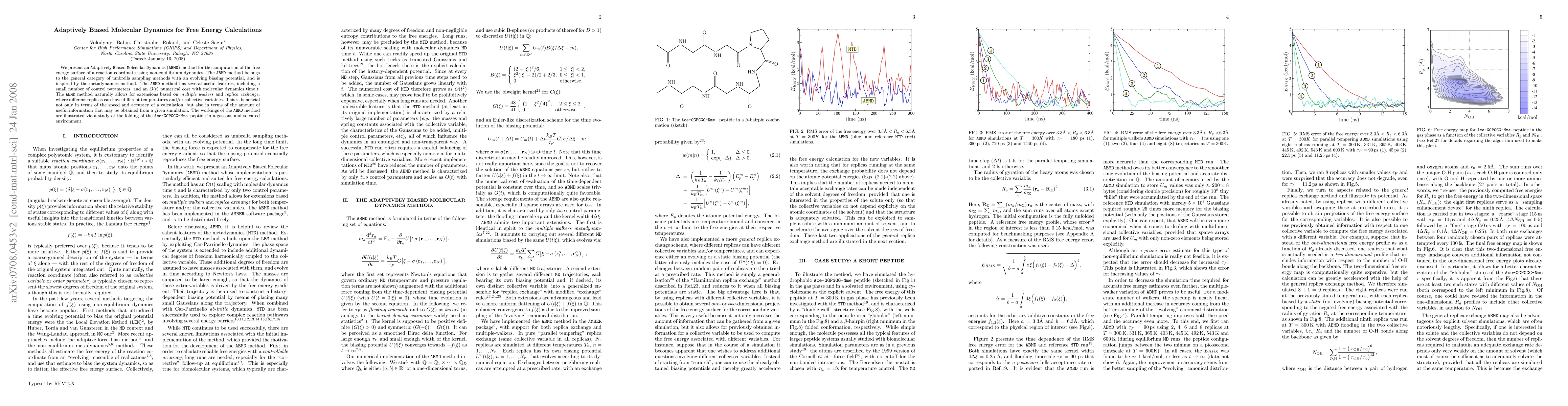 The Adaptively Biased Molecular Dynamics (ABMD) method is introduced for efficient free energy surface calculations using non-equilibrium dynamics, featuring a small number of control parameters and an $O(t)$ numerical cost. The method allows for extensions with multiple walkers and replica exchange, enhancing both speed and accuracy, as demonstrated through the folding study of the Ace-GGPGGG-Nme peptide.
